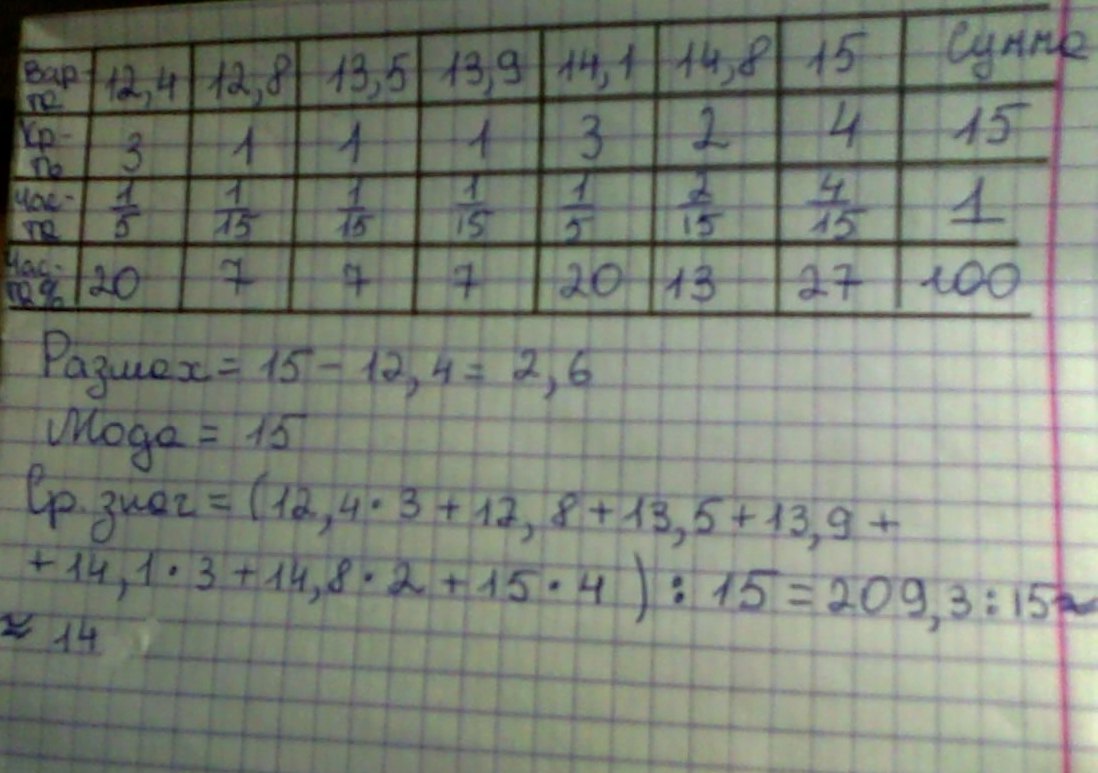 На детской экспериментальной гидрометеостанции ученик производил замертемпературы воздуха в течение 15 дней мая в одно и то же время и получил следующийряд значений: 12,4; 12,4; 12,8; 14,1; 15; 15; 14,8; 14,1; 13,9; 13,5; 15; 15; 14,8; 14,1; 12,4 (в градусах цельсия)