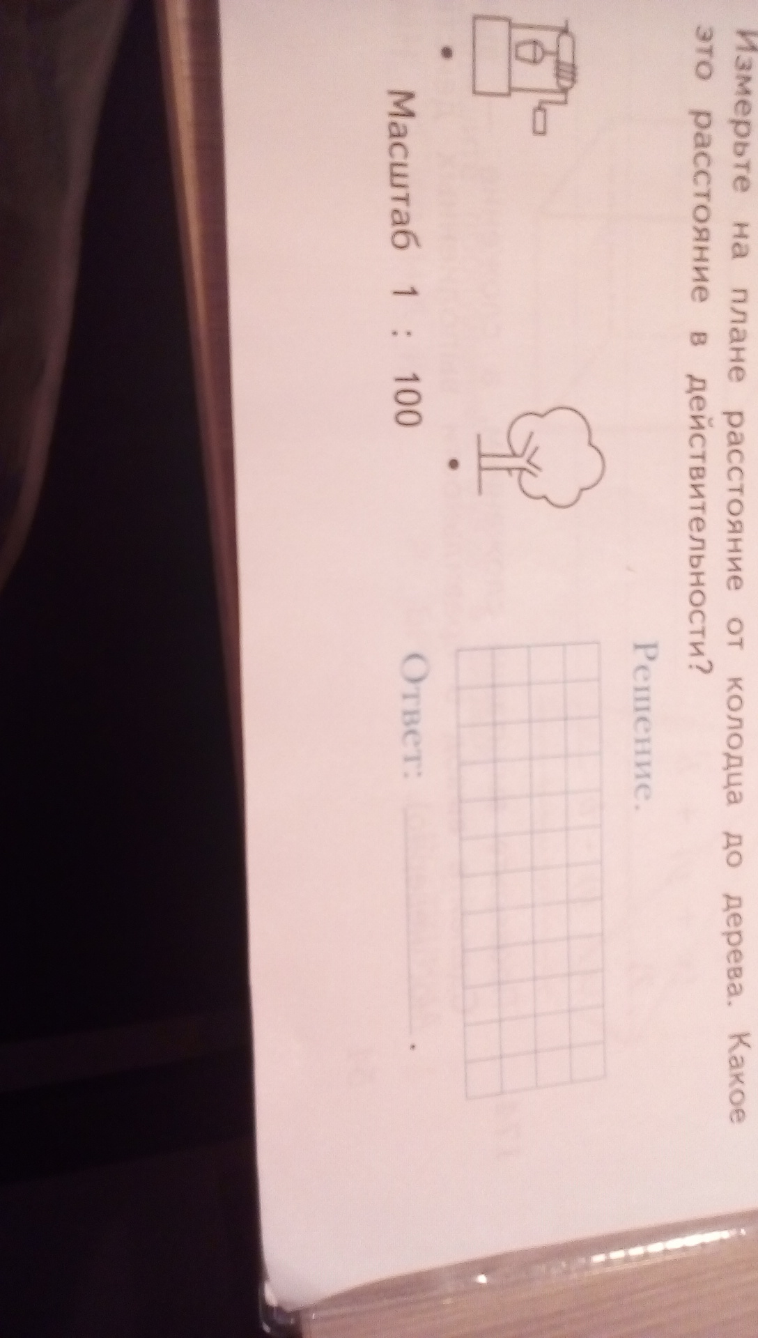 вам нужно измерить расстояние от колодца до дерева (у меня на экране=7 см, я не могу знать как у вас в учебнике)