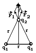 Два одинаковых точечных заряда q1=2 нКл находятся в воздухе на растоянии r=15 см друг от друга. С какой силой они действуют на заряд q2=6 нКл, находящийся на таком же расстоянии от каждого из них?