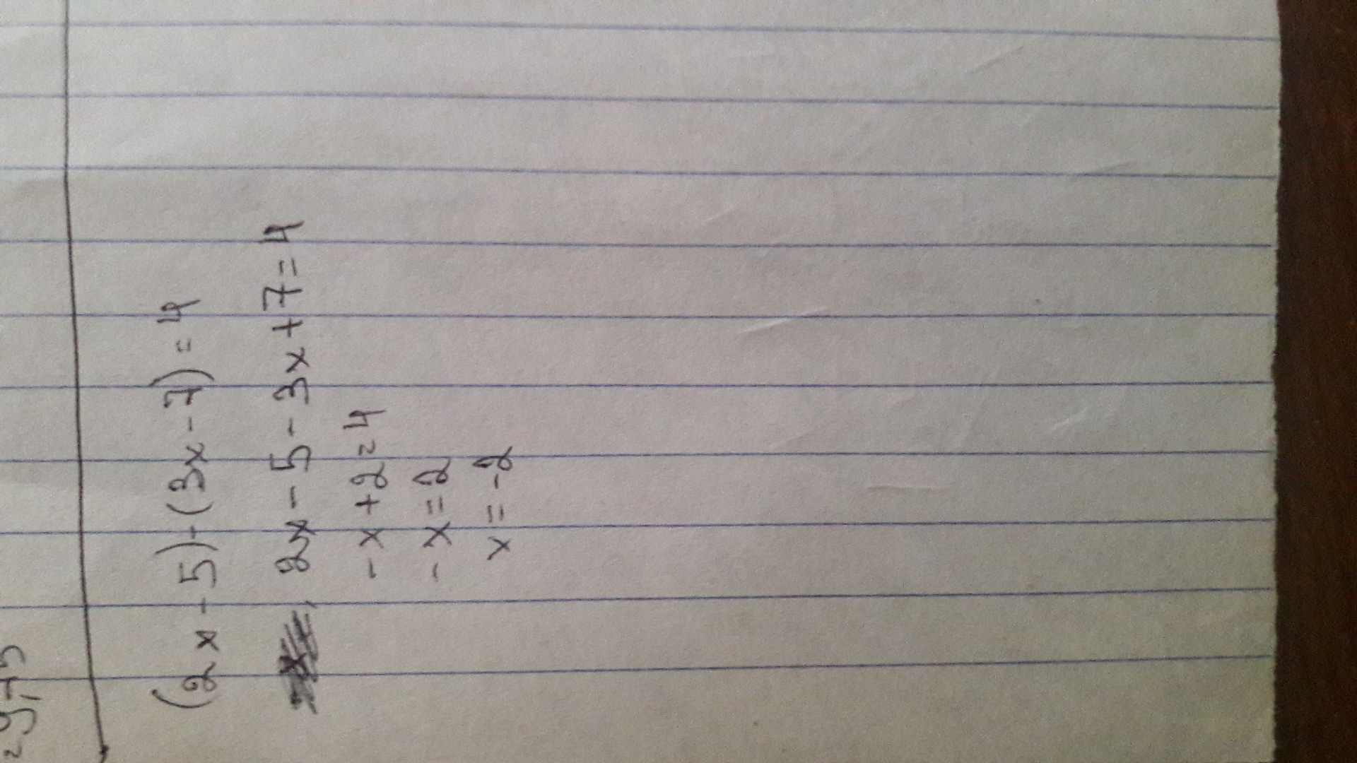 ( 2x - 5 ) - ( 3x - 7 ) = 4 2x - 5 - 3x + 7 = 4