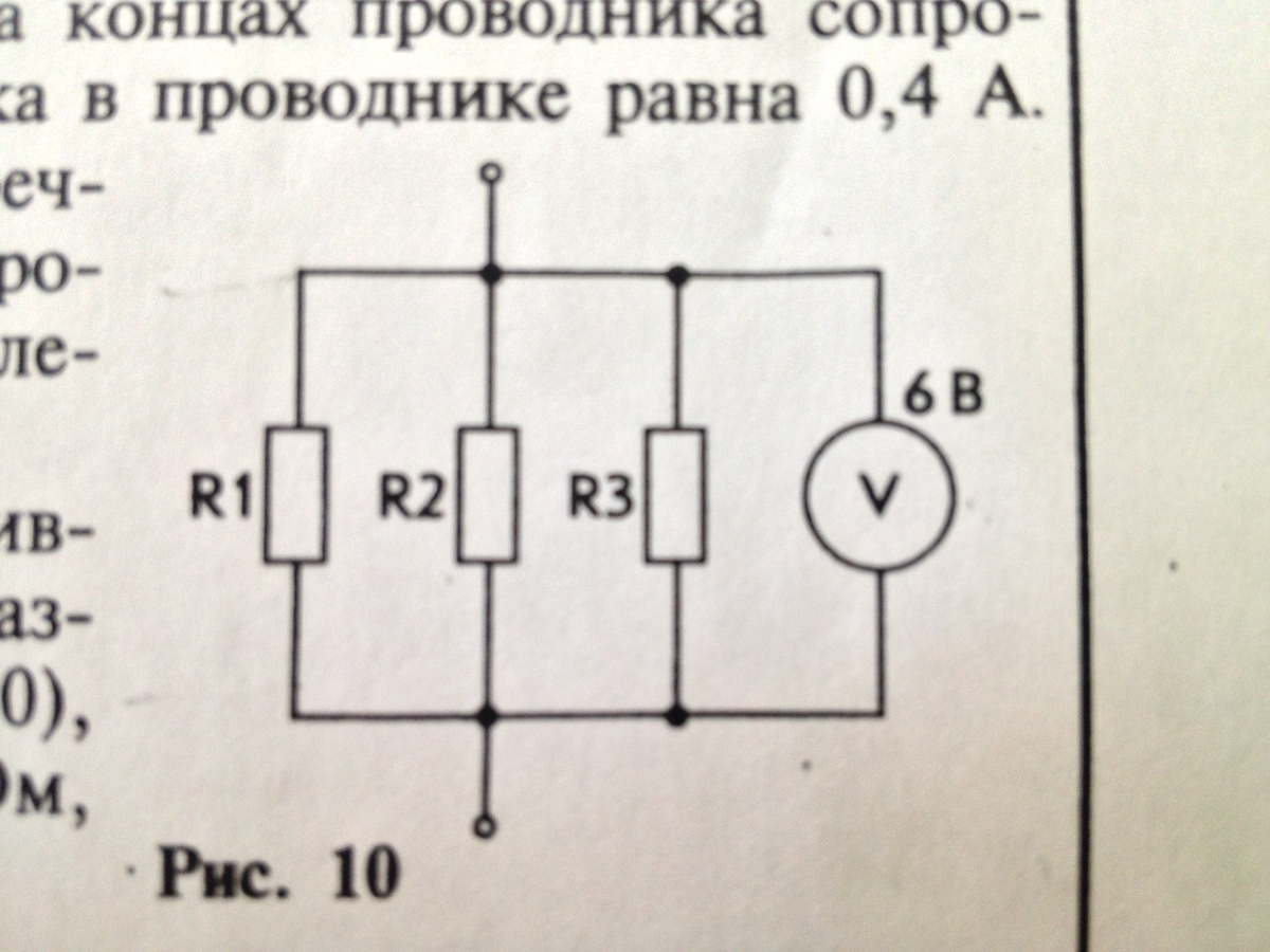 Определите общее сопротивление цепи и силу тока в неразветвленной части цепи ,если R1=30 Ом, R2=10 Ом, R3= 30 Ом, V=6В.