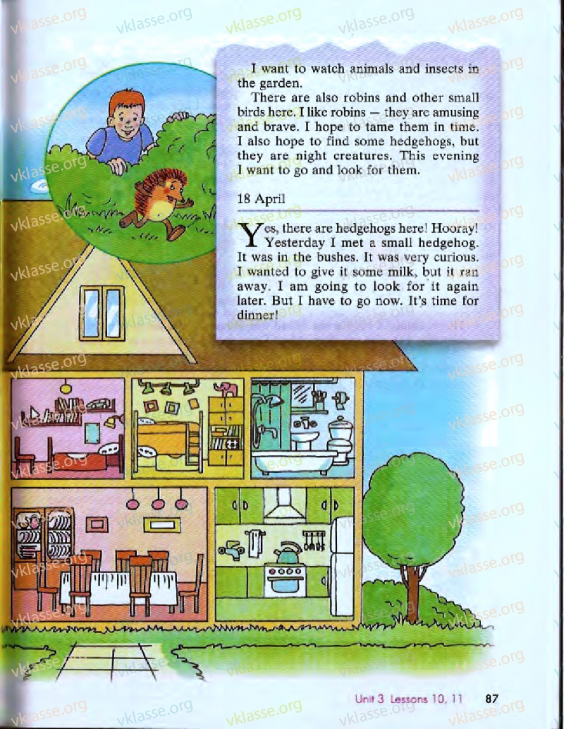 Здесь также есть малиновки и другие маленькие птички. Мне нравятся малиновки - они забавные и храбрые. Я надеюсь поймать их вовремя. Я также надеюсь найти несколько ёжиков, но они ночные создания. Этим вечером я хочу пойти и взглянуть на них.