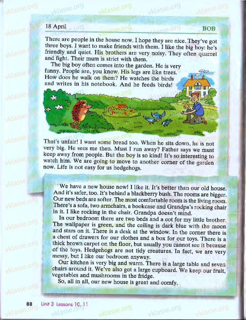 У нас появился новый дом! Мне он нравится. Он лучше, чем наш старый дом. И он надёжнее. Он находится за кустом ежевики. Комнаты больше. Наши новые кровати мягче. Самая удобная комната - гостиная. Здесь есть диван, 2 кресла, книжный шкаф и дедушкино кресло-качалка.Я люблю качаться в кресле. Дедушка не против.