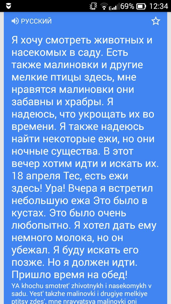 Да, ёжики здесь! Ура! Вчера я встретил маленького ёжика. Он был в кустах. Он был очень любопытным. Я хотел дать ему немного молока, но он убежал. Я собираюсь посмотреть на него снова позже. Но сейчас я должен идти. Время ужина (или обеда, 2 значения слова)!