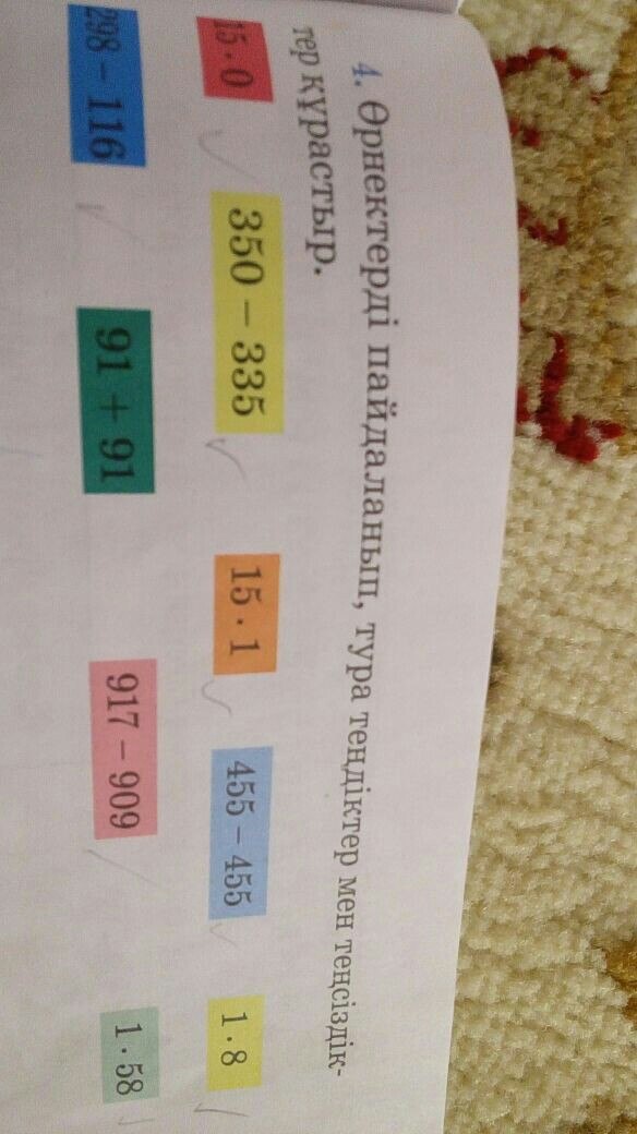 15×0=0, 350-335=15, 15×1=15, 455-455=0, 1×8=8, 298-116=182, 91+91=182, 917-909=8, 1×58=58.