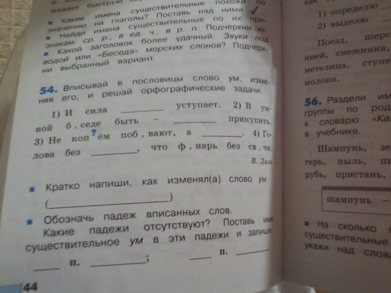 И сила уму (д.п) уступает. 2. В умной (Им. п) беседе быть - ума (Р.п) прикупить. 3. Не копьем побивают, а умом (Т.п.). 4. Голова без ума (Р.п), что фонарь без свечи.