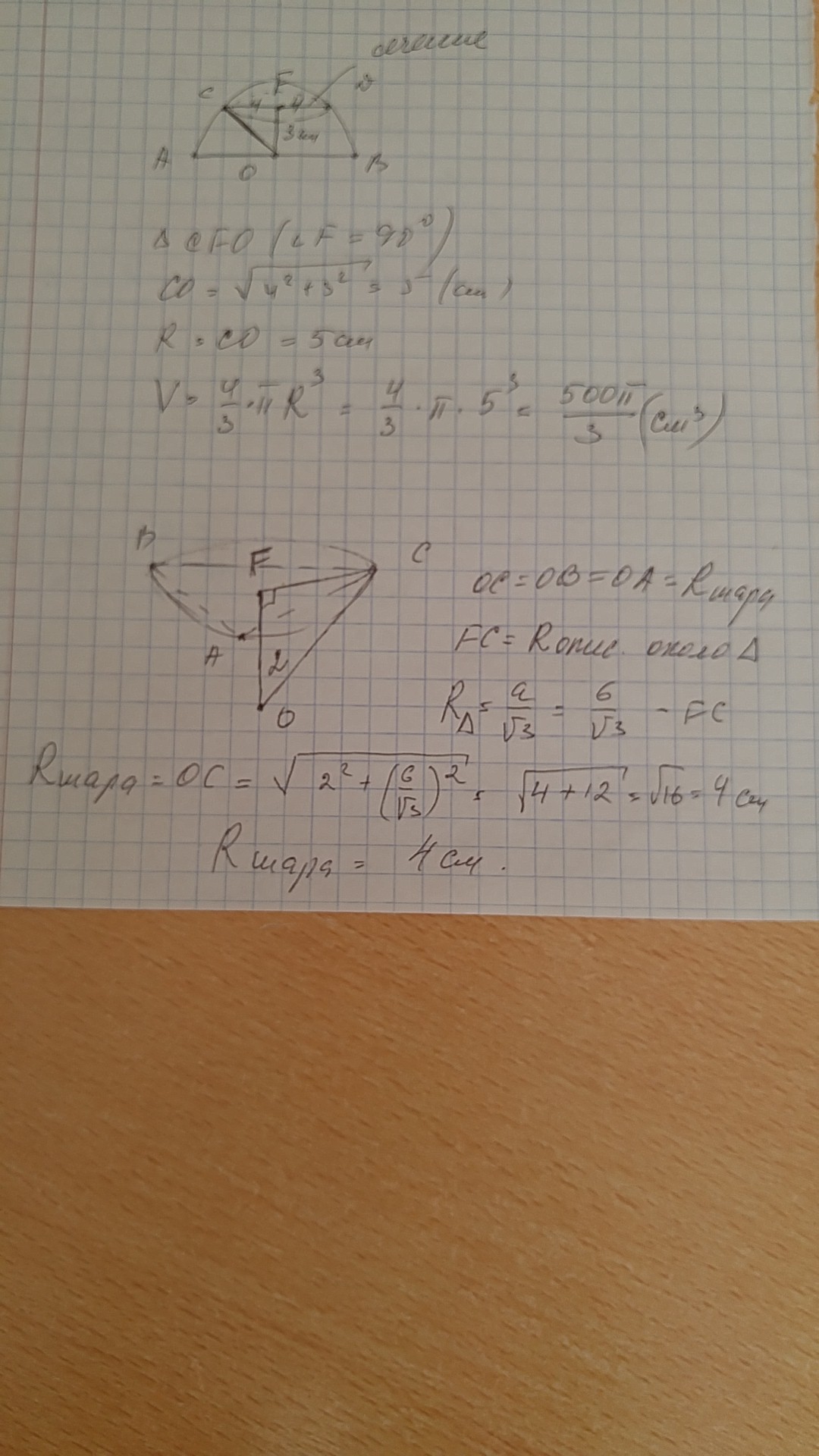 в сечение шара вписан равносторонний треугольник со стороной 6 см. расстояние от центра шара до плоскости треугольника равно 2 см. найдите радиус шара