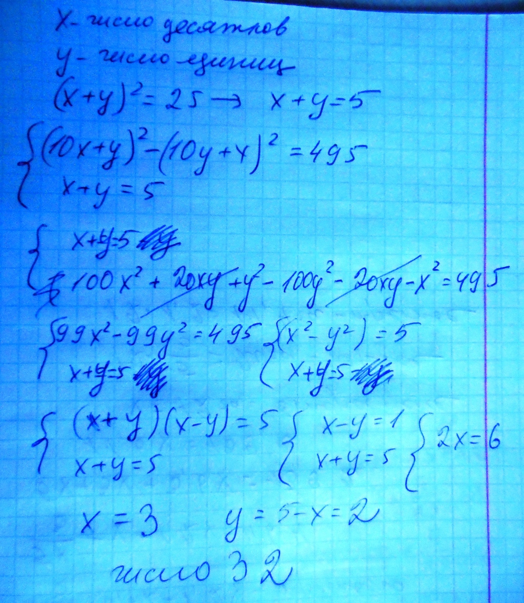 2.КВАДРАТ СУММЫ ЦИФР ДАННОГО ЧИСЛА РАВЕН 25.Разность квадратов данного числа и числа,записанного теми же цифрами,но в обратном порядке,равна 495.Найдите данное число