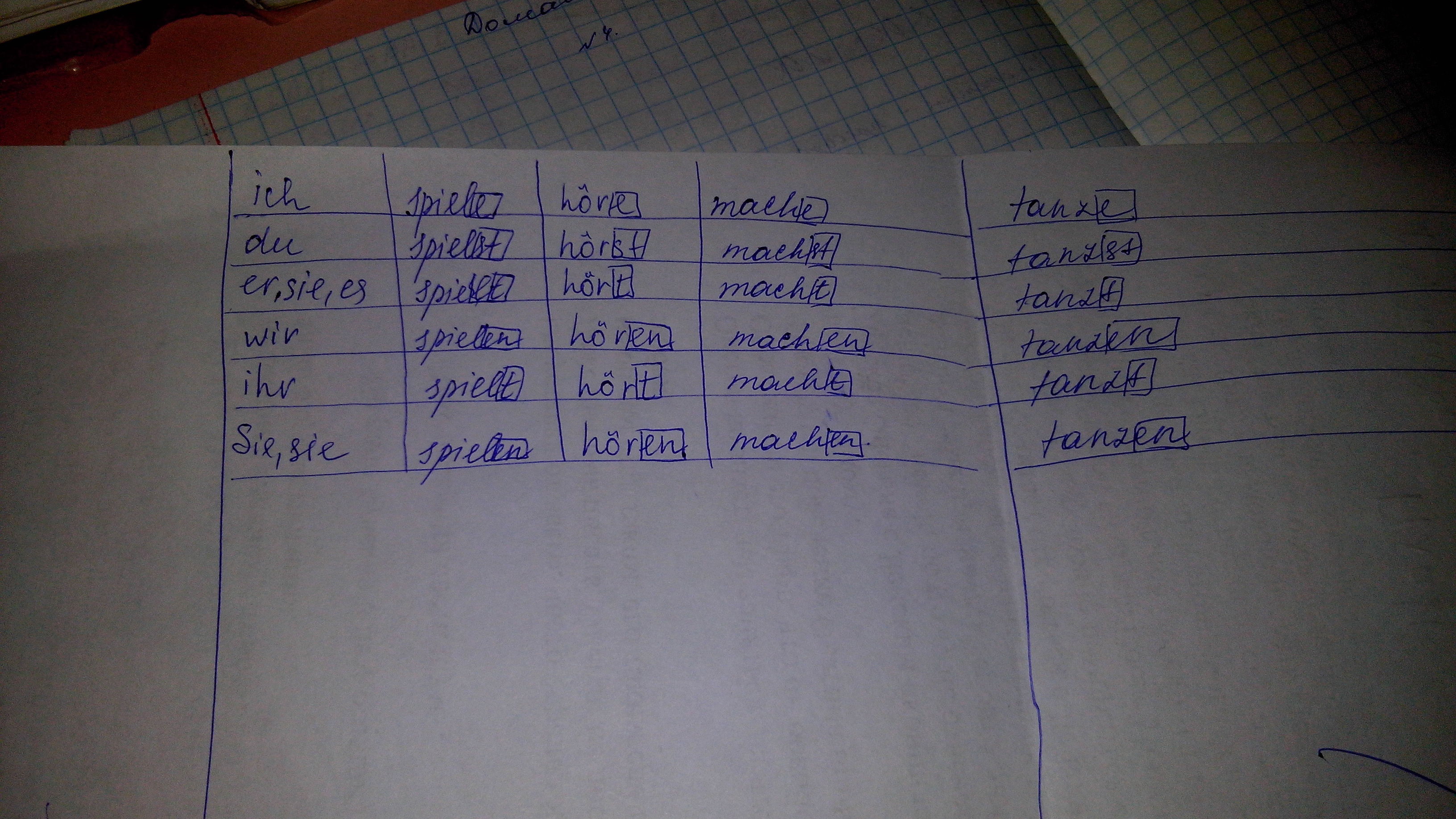 помогите даю очень много баллов (только пишите правильно) просклоняйте глаголы по немецкому : tanzen,spielen,horen,machen по такому типу: табличка обведена карандашом
