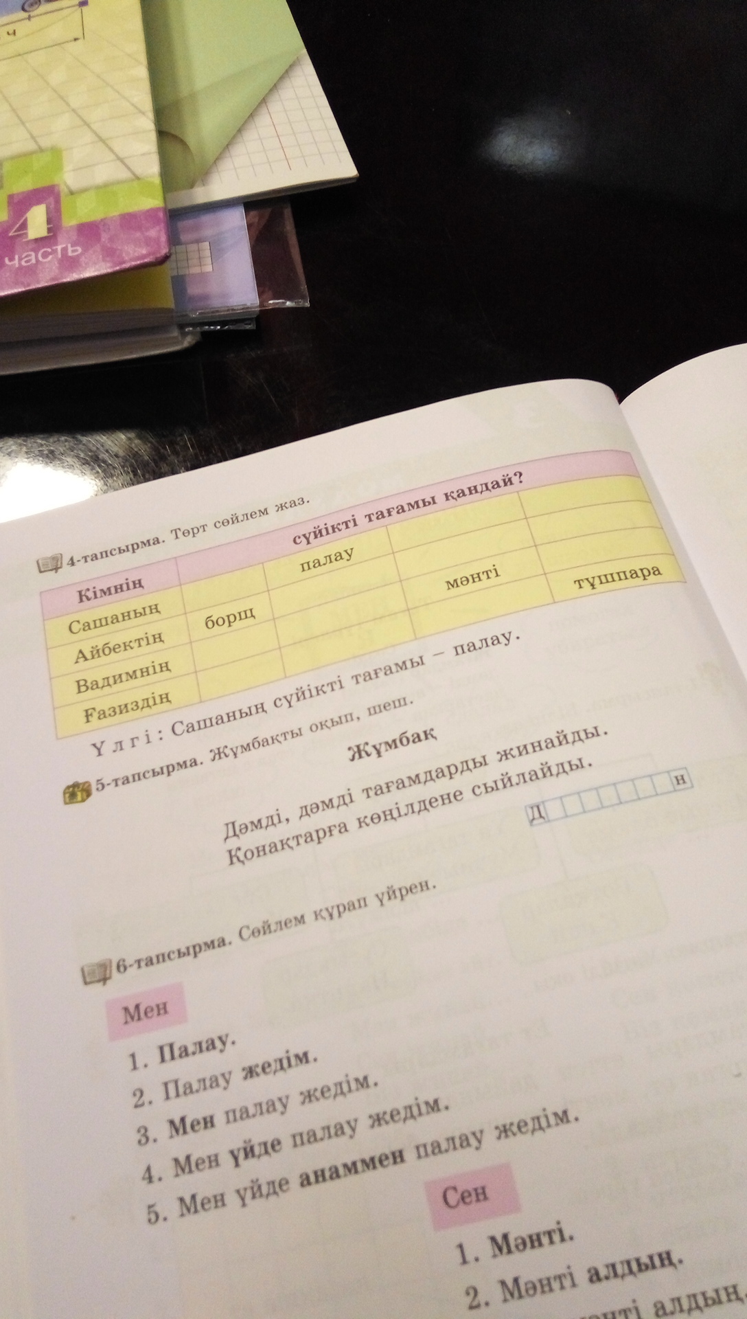 Айбектің сүйікті тағамы-борщ Вадимнің сүйікті тағамы-мəнті.Ғазиздің сүйікті тағамы-тұшпара.