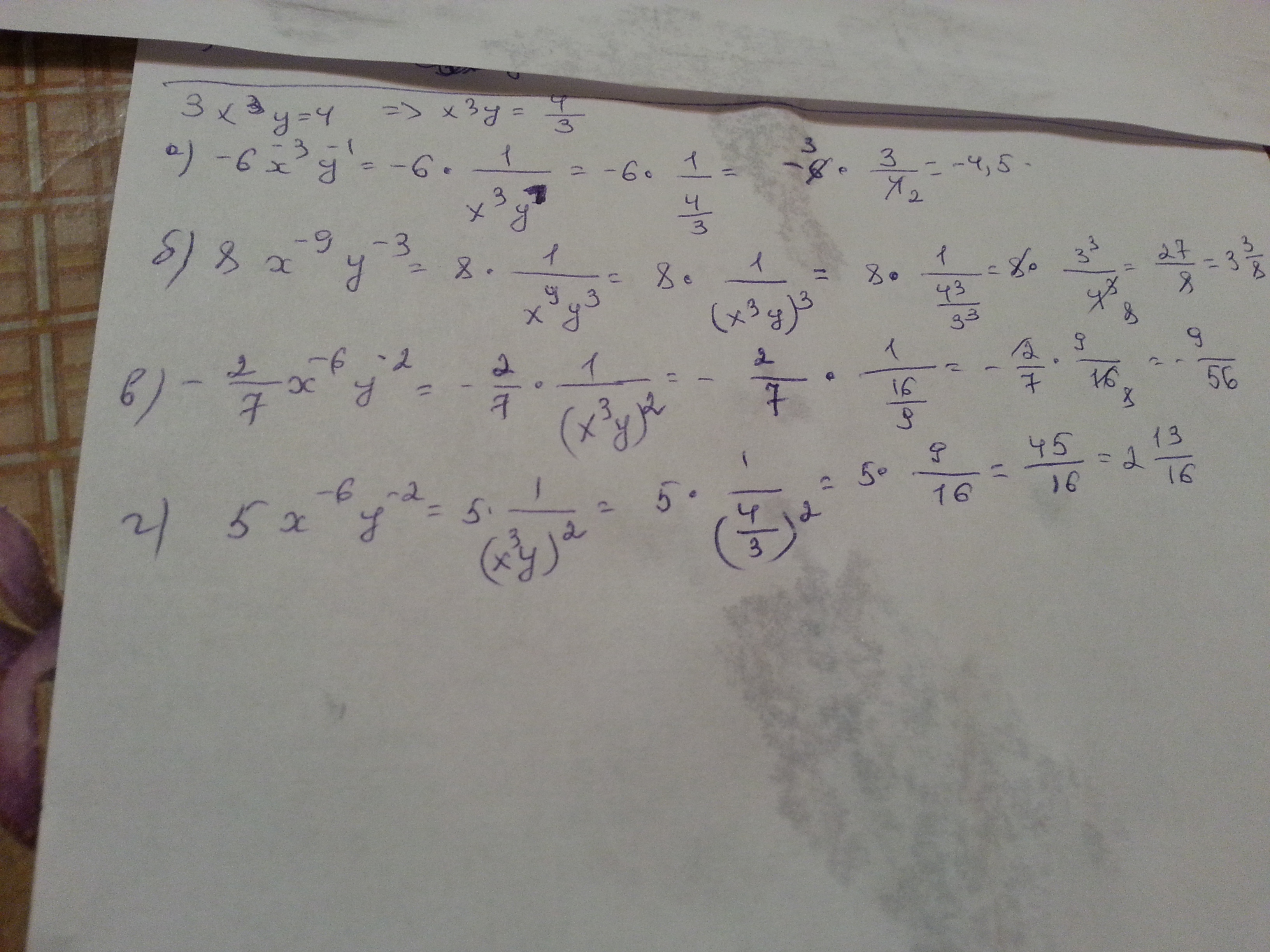 Известно , что 3x^3y=4 Найдите: -6x^-3*y^-1; 8x^-9*y^-3; -2/7*x^-6*y^2; 5x^-6*y^-2