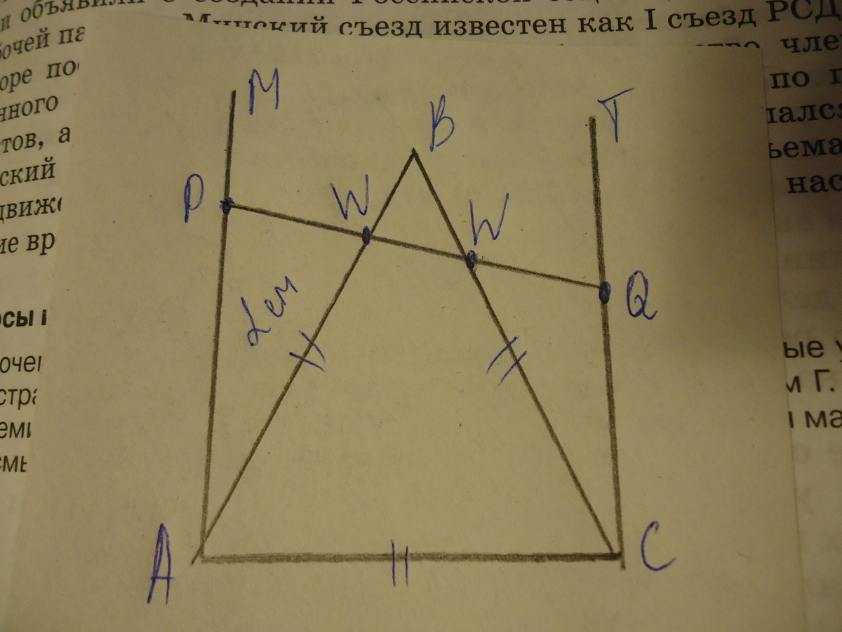 ABC — равносторонний треугольник, AB=2. На параллельных прямых AM и CT отмечены точки P и Q соответственно так, что AP:CQ=5:3. Прямая PQ пересекает плоскость ABC в точке W. Найдите WB.