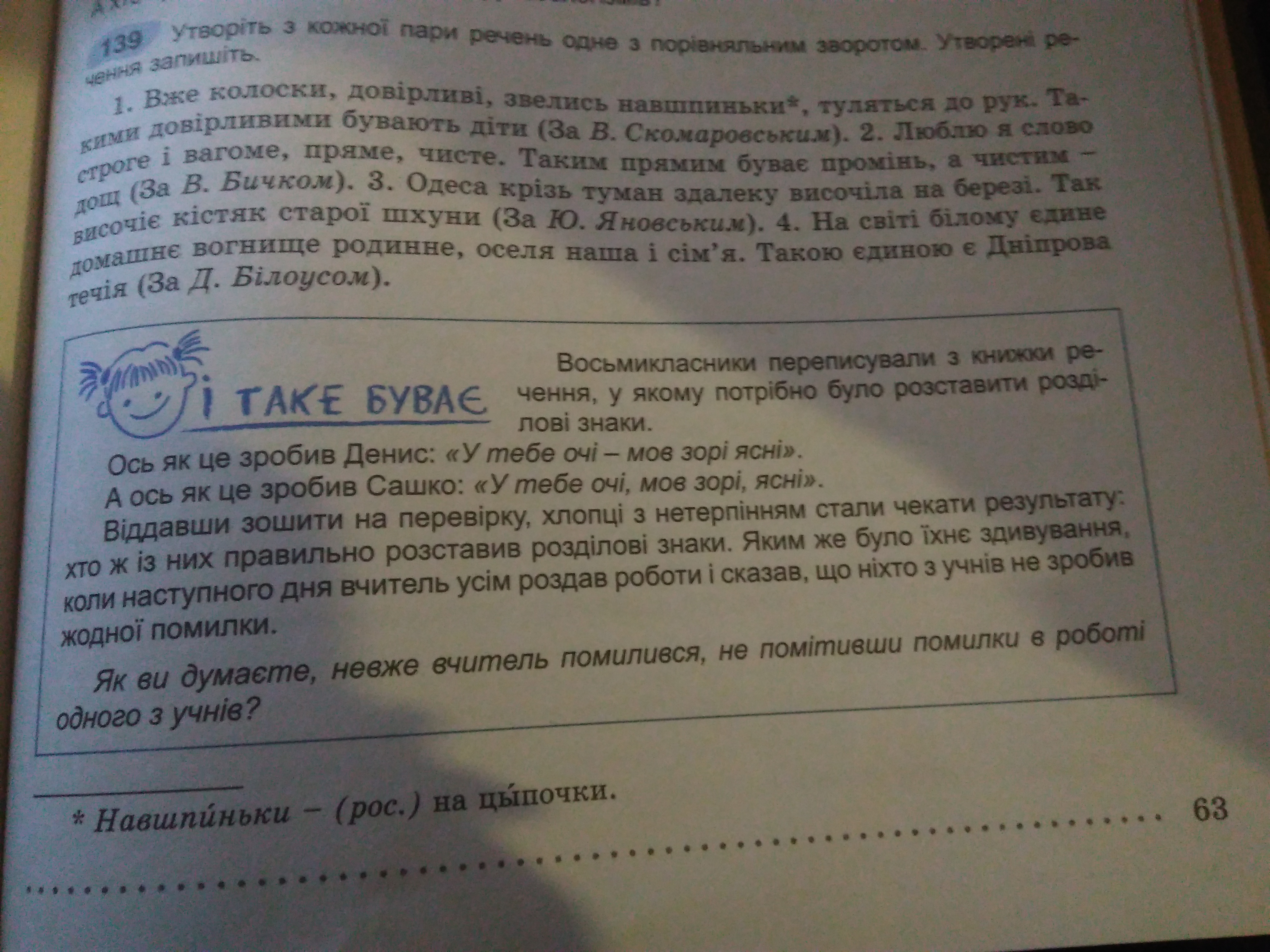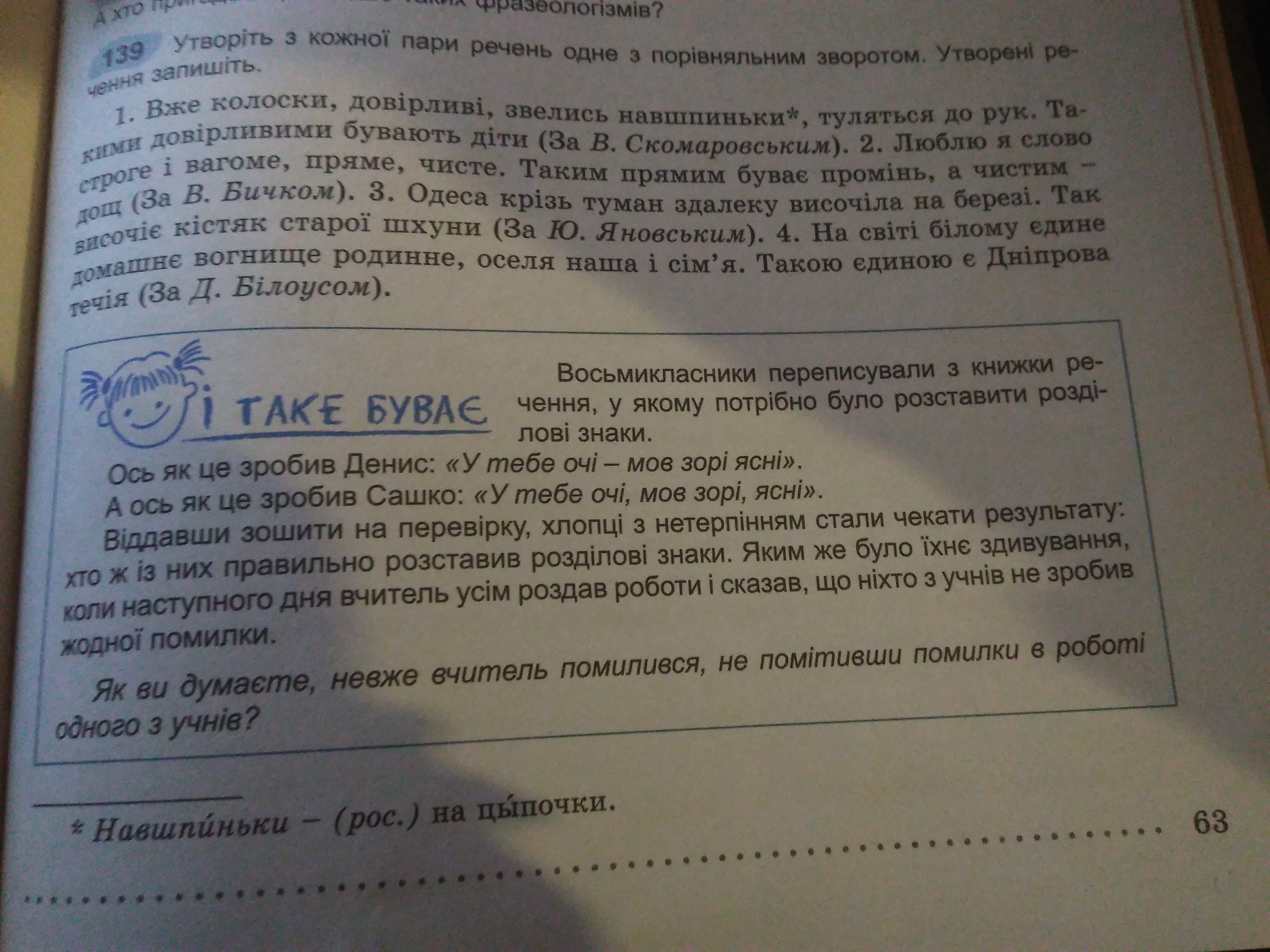 Вже колоски, довірливі, мов діти,звелись навшпиньки, туляться до рук.Люблю я слово строге і вагоме, пряме, як промінь, чисте, наче дощ. Одеса крізь туман здалеку височіла на березі, мов кістяк старої шхуни. На світі білому єдине, наче Дніпрова течія, домашнє вогнище родинне, оселя наша і сім'я.