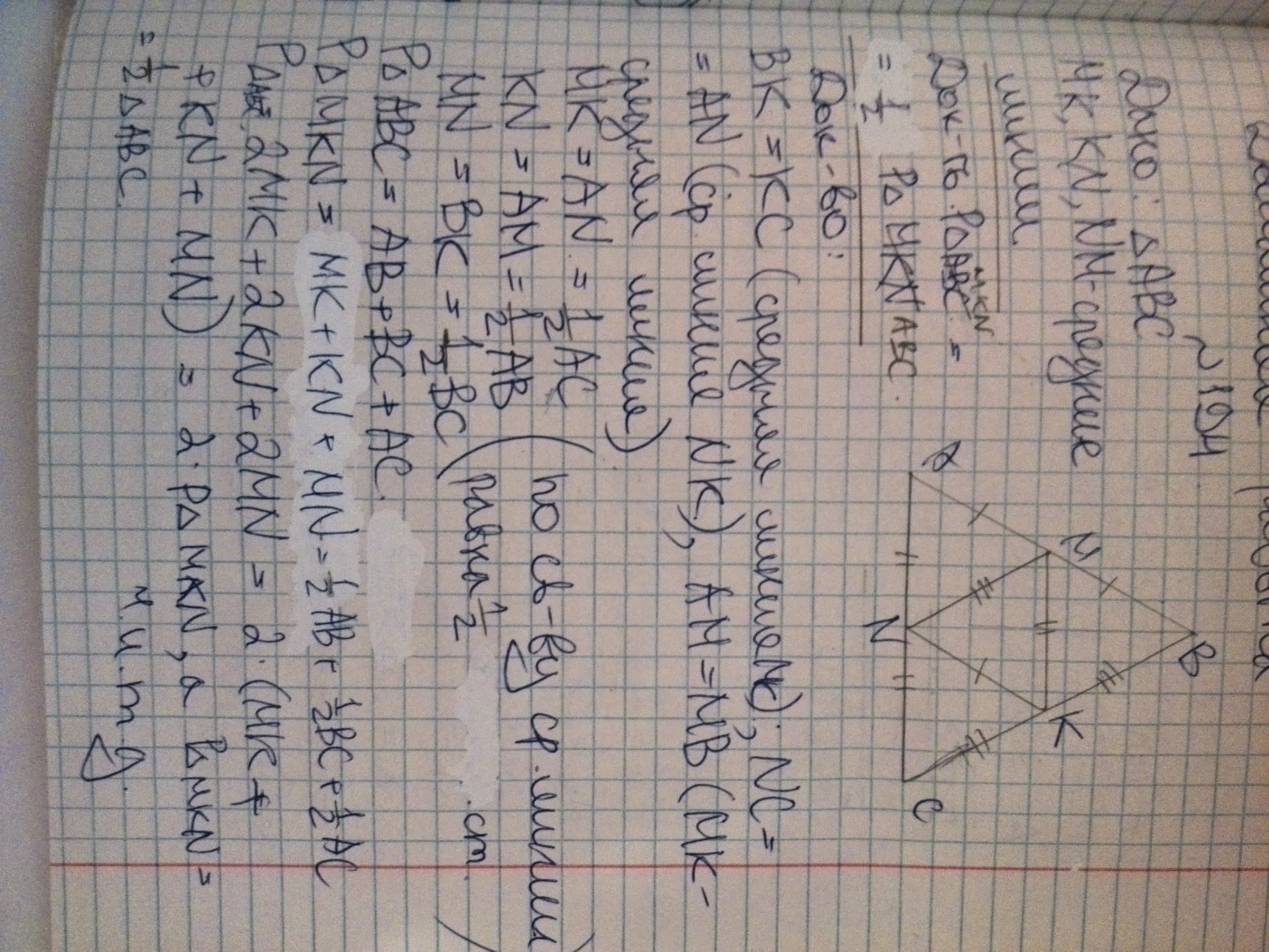Докажите,что периметр треугольника,стороны которого являются средними линиями треугольника АВС,равен половине периметра треугольника АВС. Срочно!
