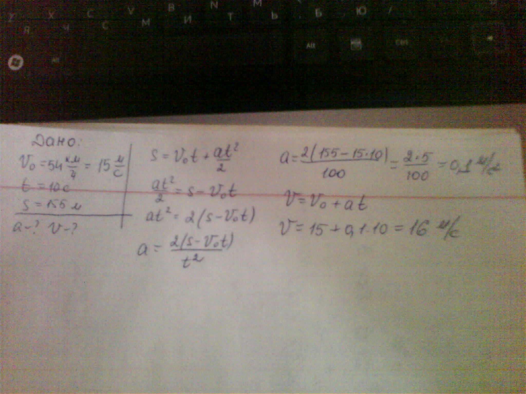 Двигаясь с начальной скоростью 54км/ч, автомобиль за 10с прошел путь 155м. С каким ускорением двигался автомобиль и какую скорость он приобрел в конце пути?