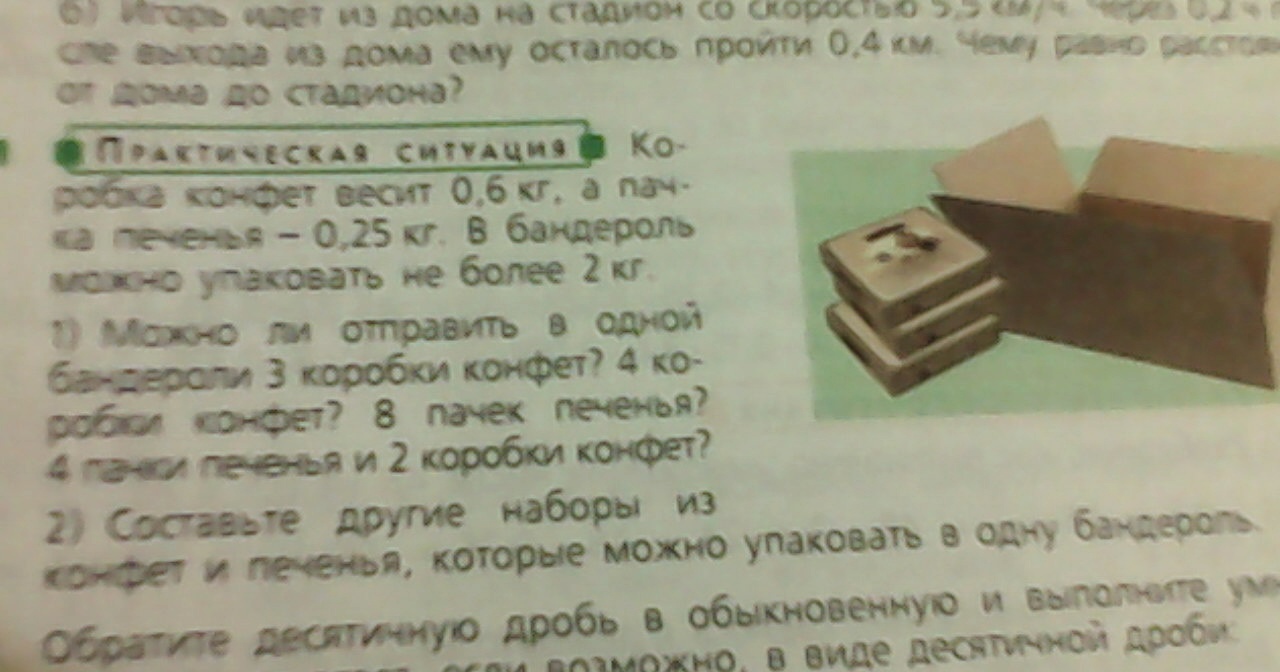 4) (0,25*4)+(0,6*2)=1+1,2=2,1(kg)- нельзя 4 пачки печенья и 2 пачки конфет