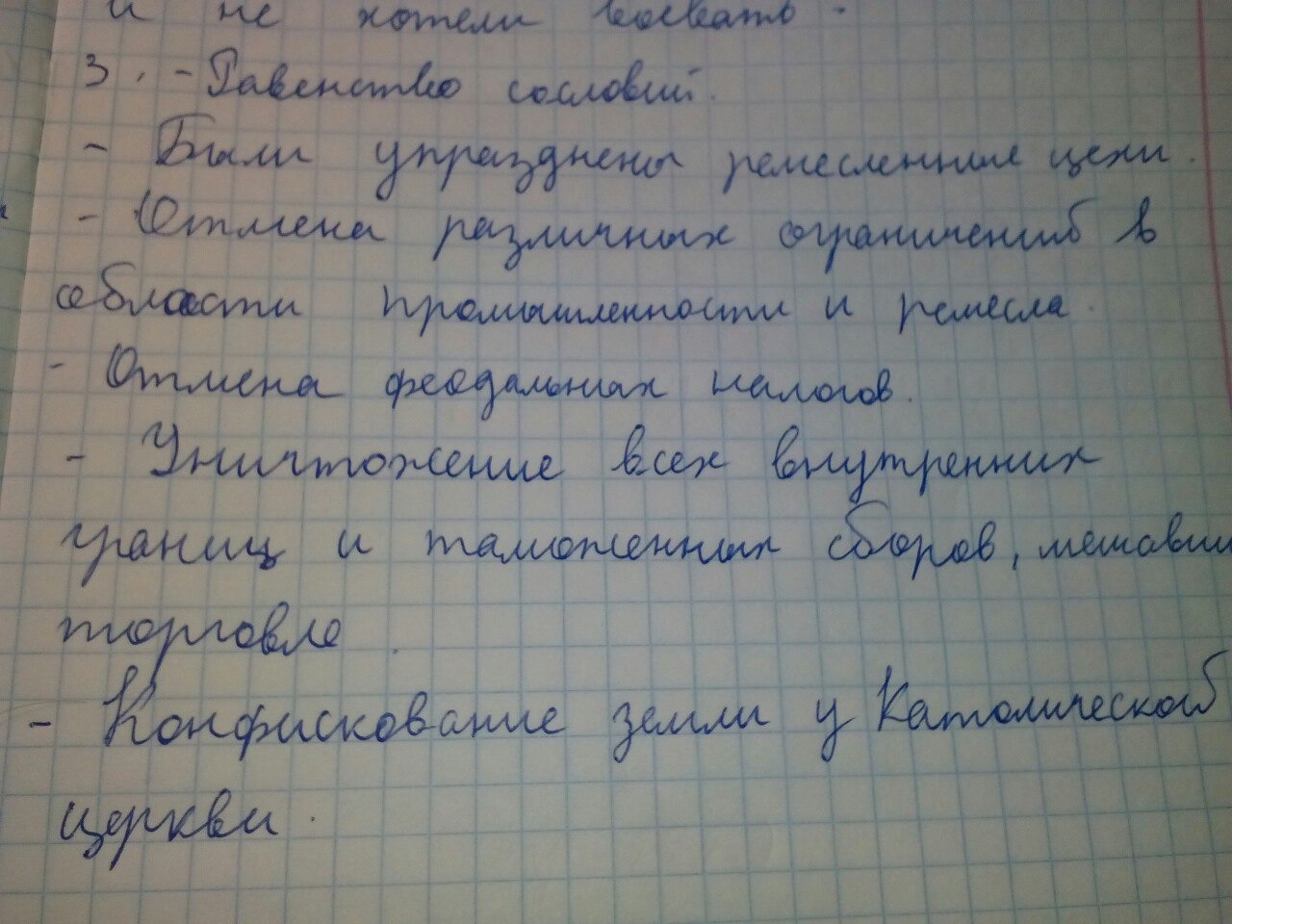 3)Равенство сословий, конфискованные земли у Католической церкви, отмена феодальных налогов. и т. д. Надеюсь, поймёшь.