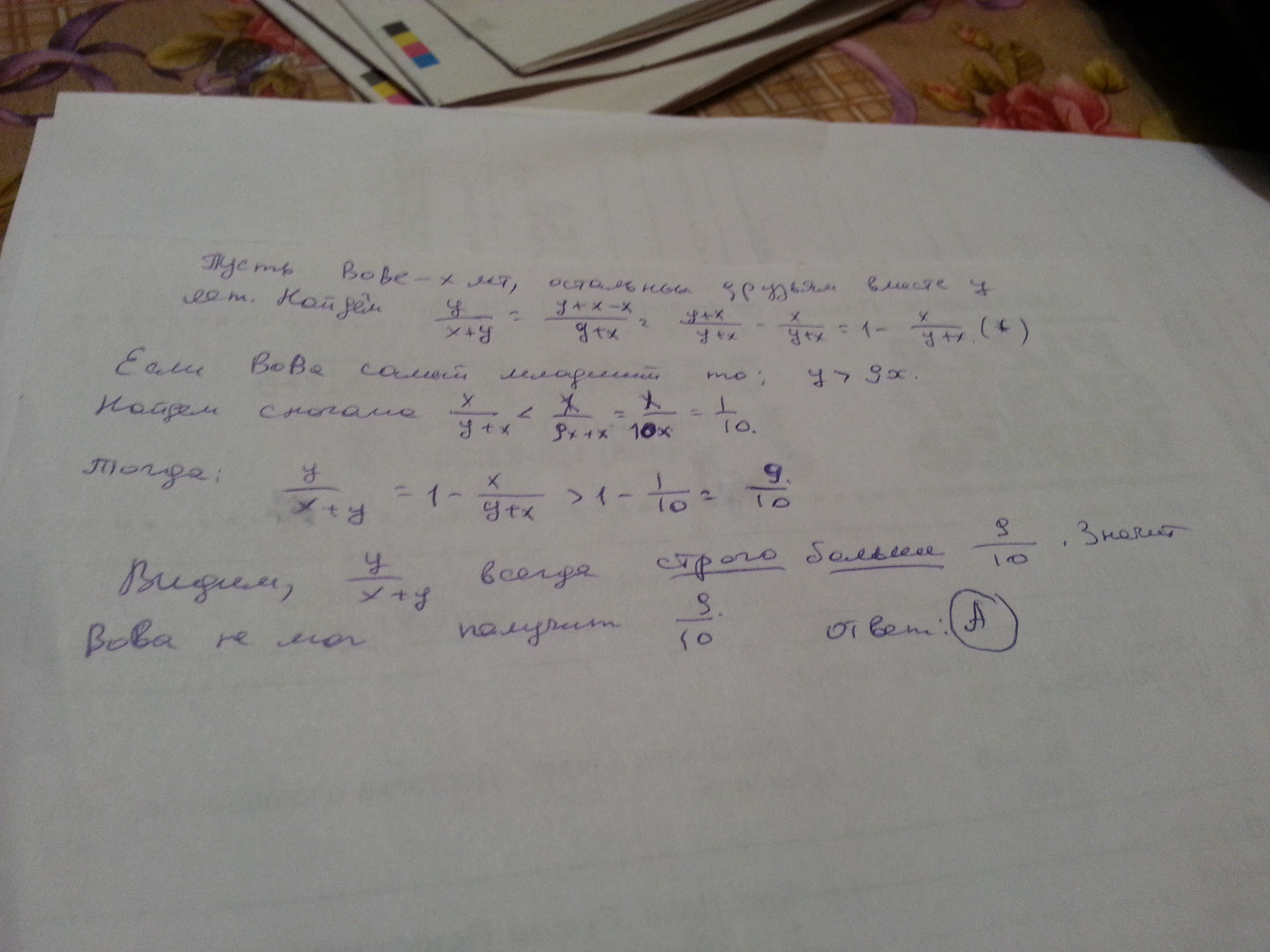 собрались 10 друзей среди которых самым младшим был Вова любитель математики . он нашел отношение сумы возрастов всех остальных друзей к сумме возвратов всех собравшихся . какое из чисел приведенных в ответах оне не мог получить А)9/10 Б)10/11 В)11/12 Г)12/13