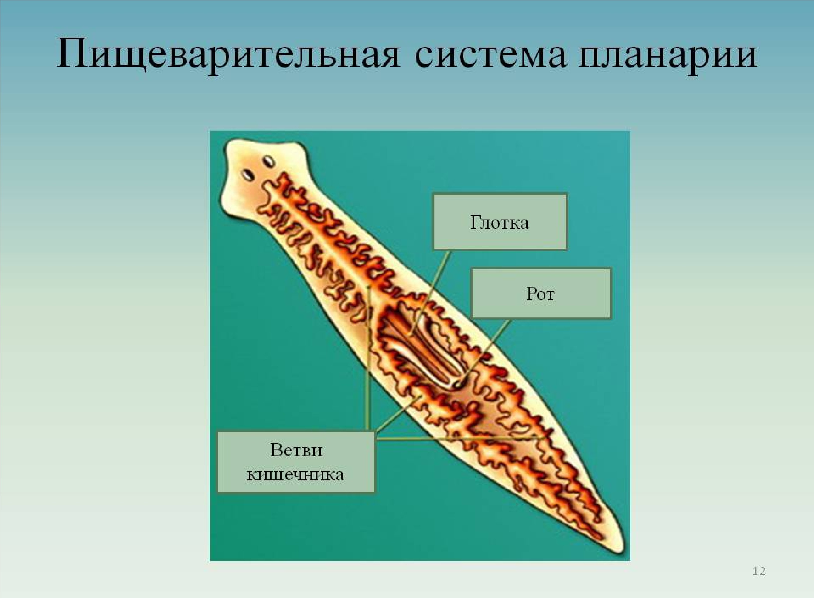 Рот у планарии находится посередине тела, на брюшной стороне. Он ведет в глотку. Это ловчий аппарат: через рот глотка может высовываться наружу, проникать внутрь добычи, высасывать ее содержимое. Переваривание пищи происходит в разветвлениях кишечника..