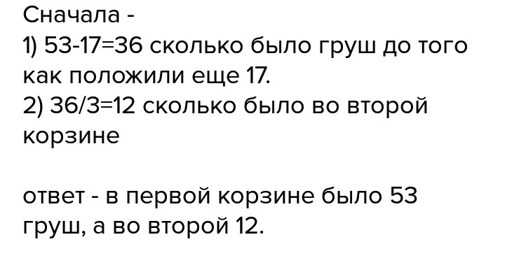 В двух корзинах 22 груши.Когда в первую корзину положили 12 груш,а во вторую-6 груш,то в обеих корзинах груш стало поровну .Сколько груш было в каждой корзине сначала?