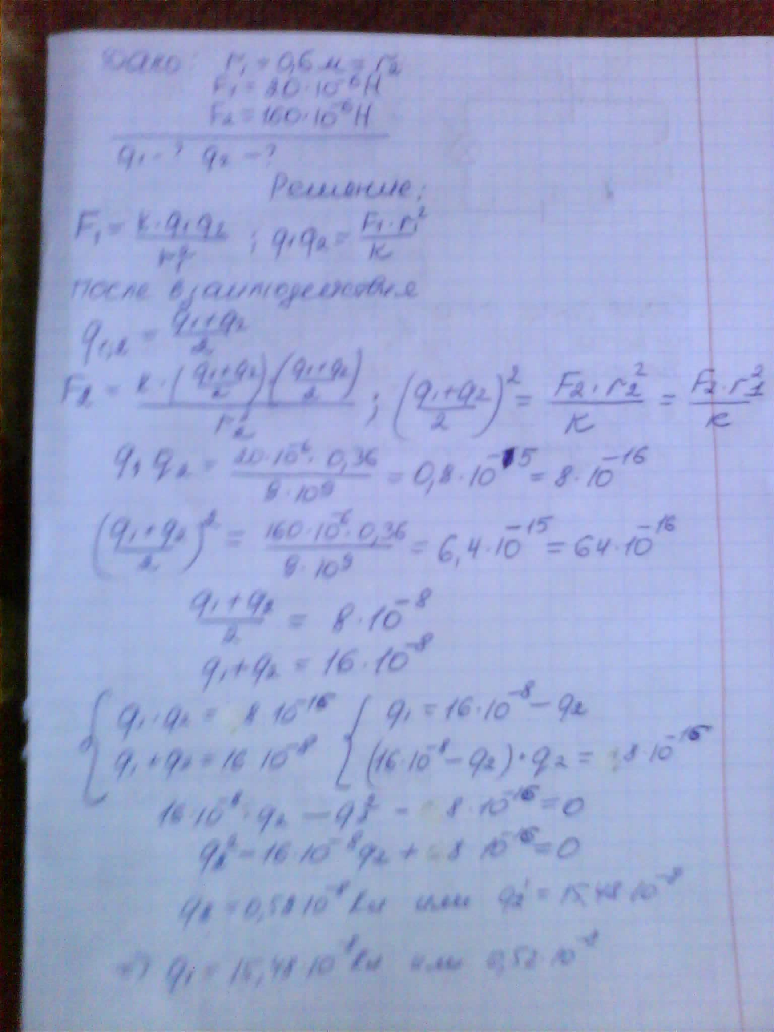Два одинаковых проводящих заряженных шарика на расстоянии 60 см отталкиваются с силой 20 мкН . После того как шарики привели в соприкосновение и удалили на прежнее расстояние сила отталкивания стала равна 160 мкН. считая заряженные шарики точечными зарядами найти заряды шариков q1 и q2 которые были на шариках до соприкосновения