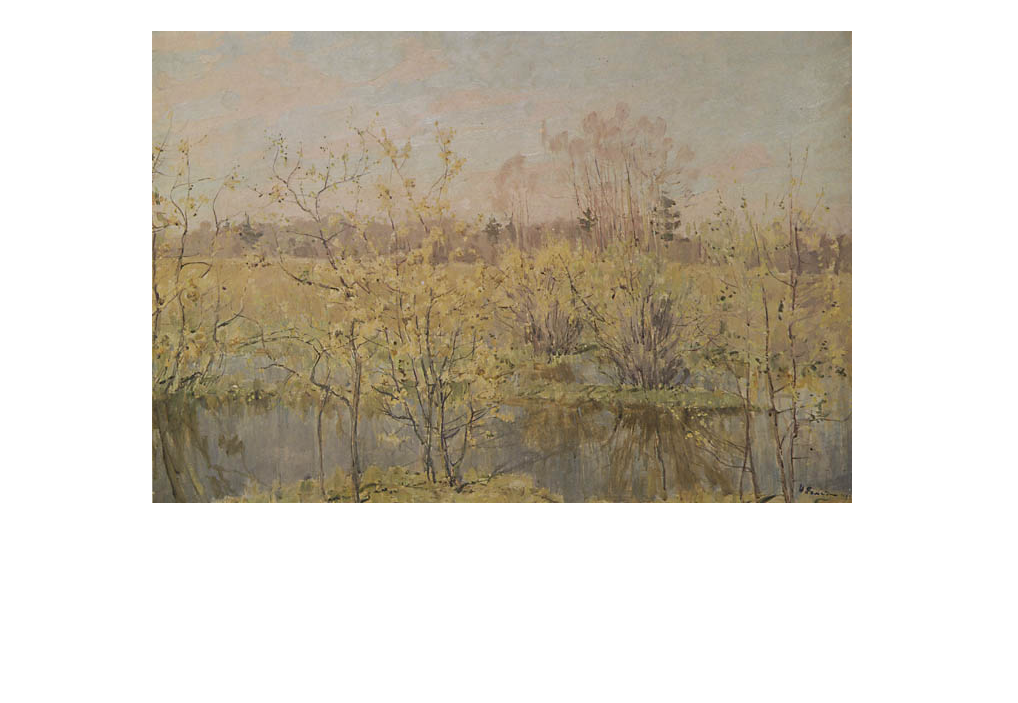 2) глядя на эту картину мы видим осенний день.листочки на деревьях только начинают распускатся.на переднем плане мы видим тихую речушку вдоль которой прастут небольшие кустарники .на заднем плане виднеется густой темный дремучий лес.картина наполнена спокойствием.казалось бы можно услышать тихое пение птиц.