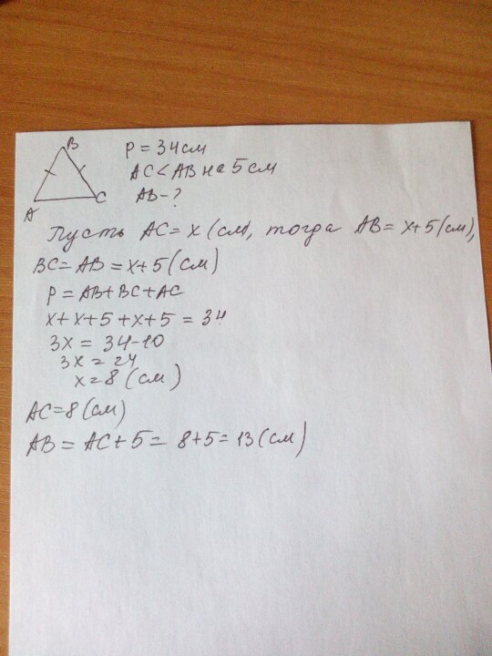 периметр равнобедренного треугольника равен 34 см основание меньше боковой стороны на 5 см.Найдите боковую сторону