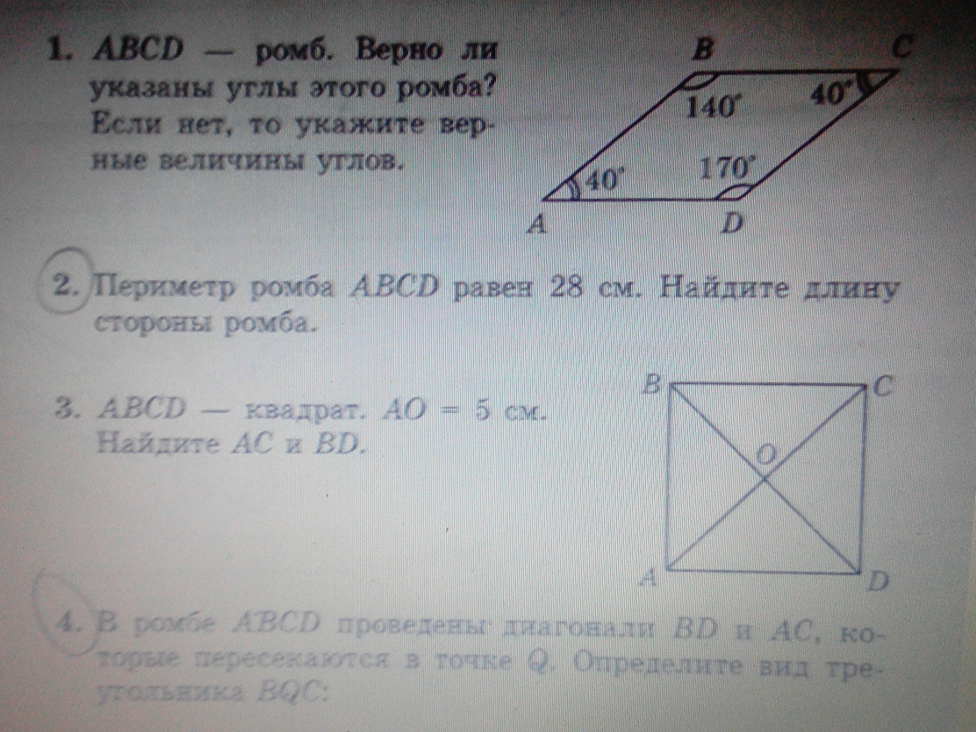 1) 360-80 =280 т.е сумма двух других равных углов 280 т.е углы будут A=C=40 B=D=140 3)диагонали квадраты равны и точкой пересечения делятся пополам Ac=10=BD