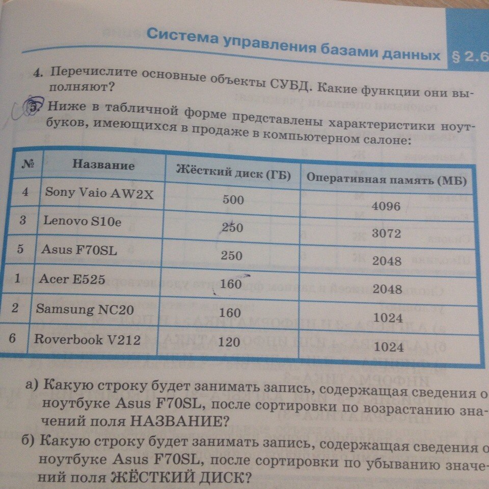 б) Какую строку будет занимать запись,содержащая сведения о ноутбуке Asus F70SL, после сортировки по убыванию значений поля ЖЕСТКИЙ ДИСК?