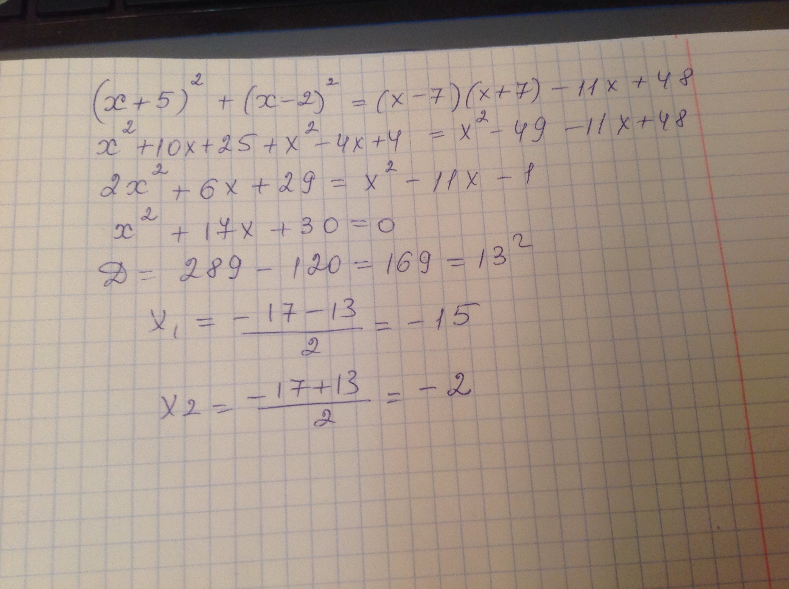 (x+5)²+(x-2)²=(x-7)(x+7)-11x+48