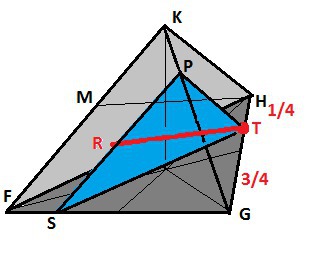 На ребре GH треугольной пирамиды FGHK с равными друг другу ребрами выбрана такая точка T, что HT:TG=1:3, и через нее проведена прямая h , параллельна медиане HM боковой грани KHF и пересекающая поверхность пирамиды в точке R. найдите ребро пирамиды, учитывая, что TR=6см