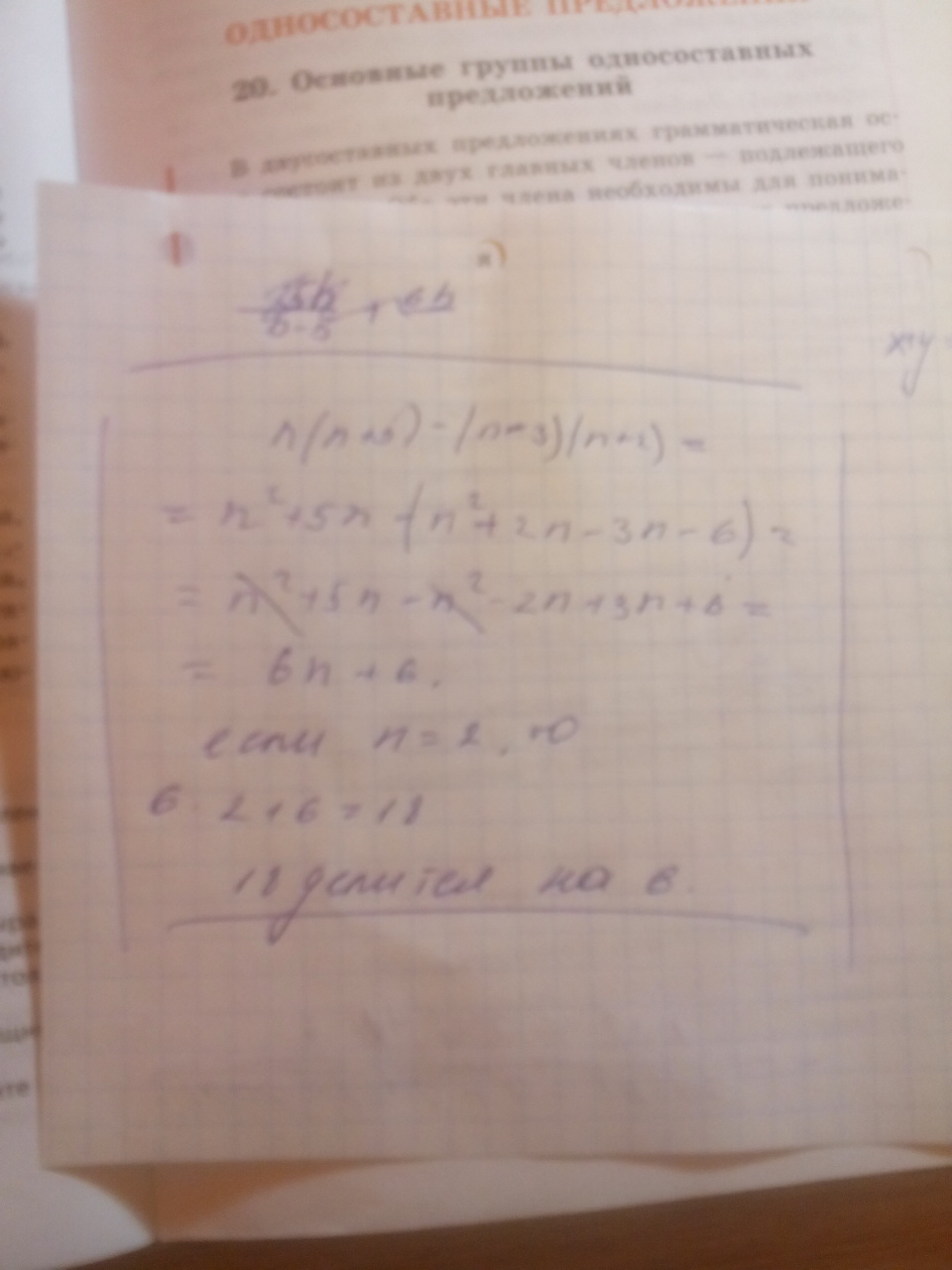 n(n+5)-(n-3)(n+2)=n²+5n-(n²+2n-3n-6)=n²+5n-n²-2n+3n+6=6n+6.