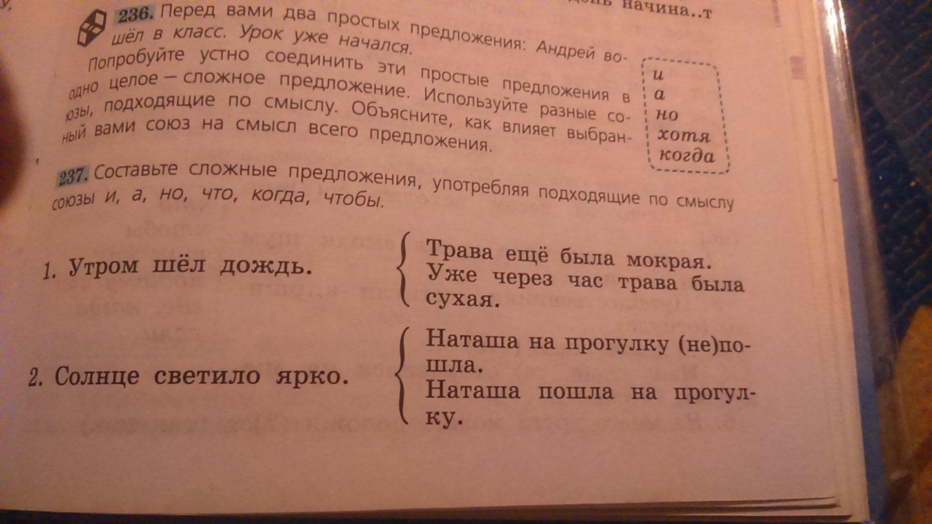 1. Утром шел дождь, но уже через час трава была сухая.2. Солнце светило ярко и Наташа пошла на прогулку.