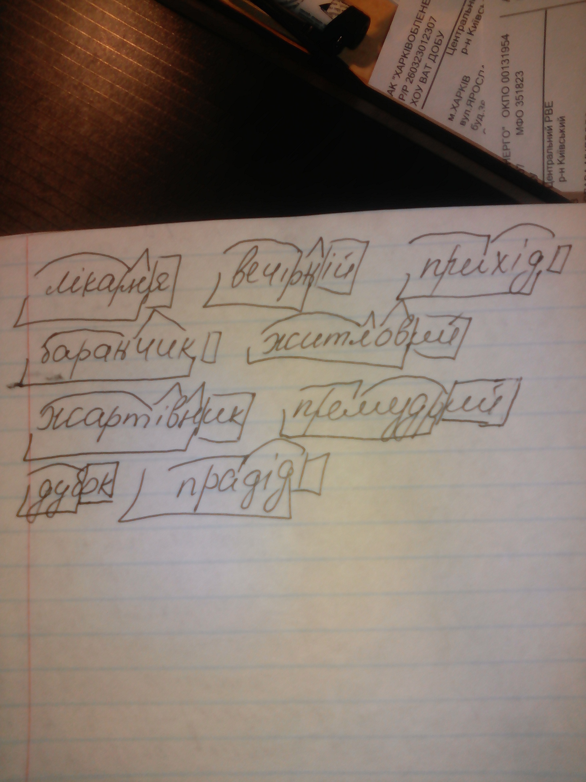 будова слова : закінчення, основна частина, корінь, префікс, суфікс. Лікарня, вечірній, прихід, баранчик, житловий, жартівник, премудрий, дубок, прадід
