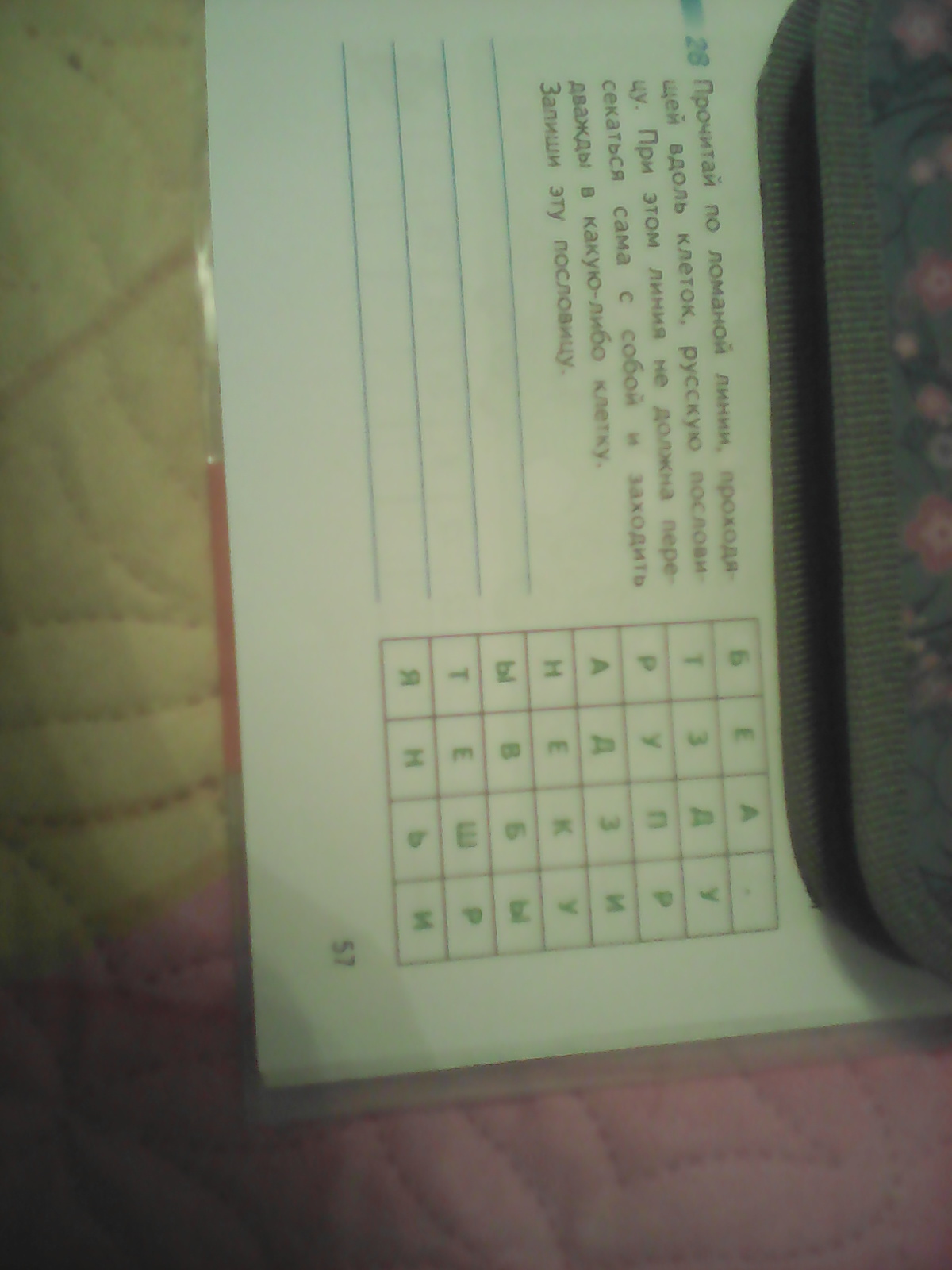 прочитай по ломаной линии,проходящей вдоль клеток,русскую пословицу. при этом линия не должна пересекатся сама с собой и заходить дважды в какую-либо клетку.запиши эту пословицу.