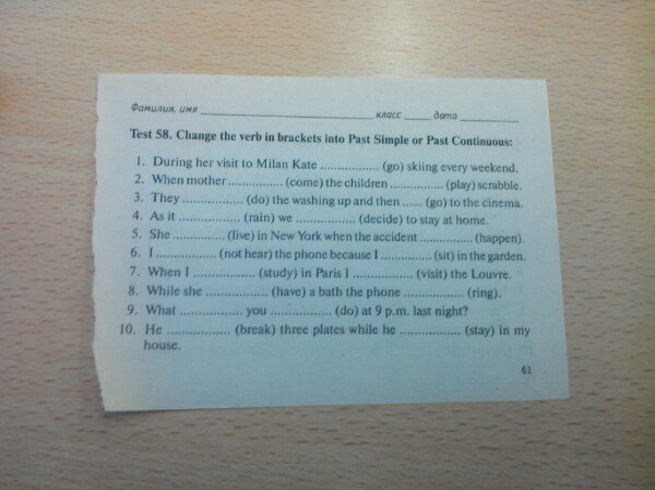 1 was going 2 came …were playing 3 did … went 4 was raining … decided 5 was living* … happened 6 didn’t hear … was sitting 7 was studying … visited 8 was having … rang 9 were you doing 10 broke … was staying