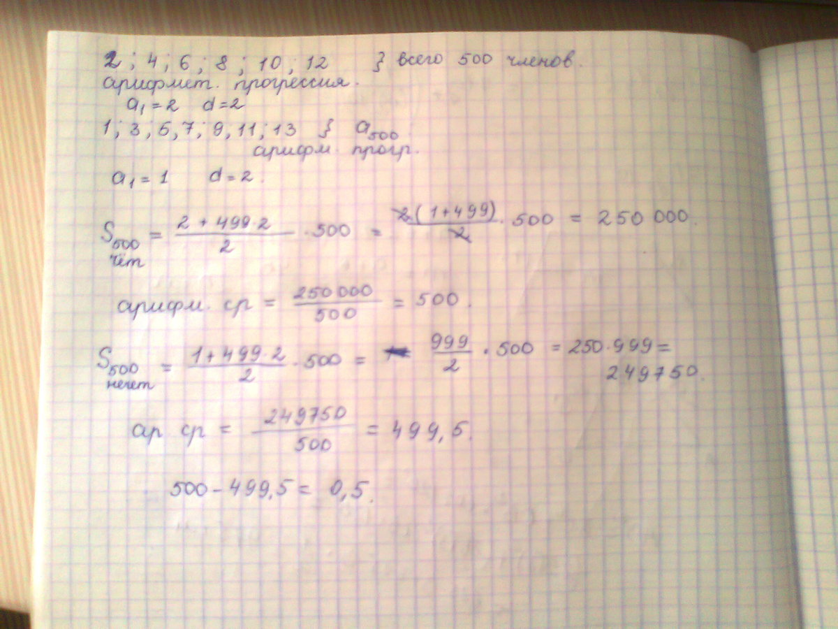 на сколько средние арифметическое всех четных чисел от 1 до 1000 больше,чем средние арифметическое всех нечетных чисел от 1 да 1000