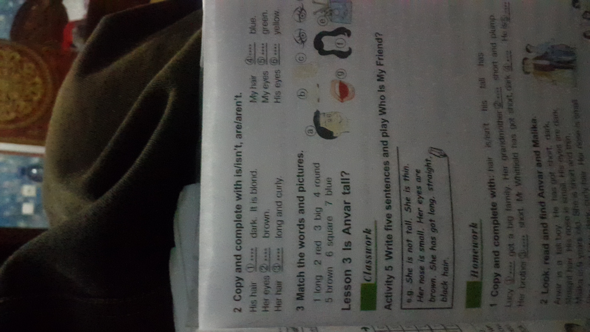 His hair isn't dark. It is blond. Her eyes are brown. Her hair are/aren't(выбери сам) long and curly. My hair isn't blue. My eyes are green. His eyes aren't yellow.