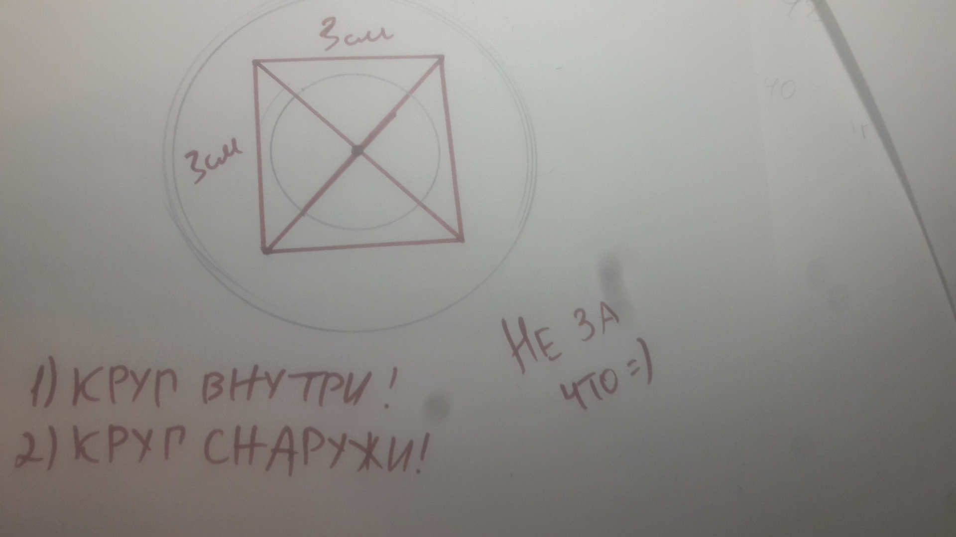 Начертите квадрат длина стороны которого равна 3 сантиметра Проведи в нем диагонали и построй окружность с центром в точке пересечения диагоналей так чтобы она не пересекалась стороны квадрата Попробуй найти два решения