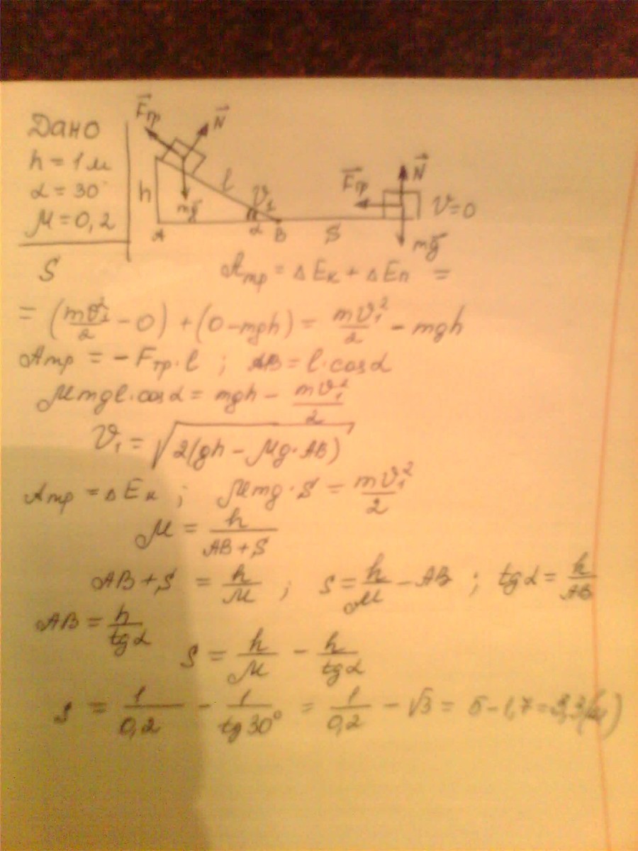небольшое тело скользит по наклонной плоскости, угол наклона которой равен 30, с высоты 1 м и продолжает движение по горизонтальной плоскости. коэффициент трения между телом и плоскостями равен 0,2. какое расстояние S пройдет тело по горизонтальной плоскости.