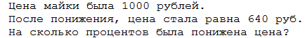 3) Найдем, сколько процентов от 1000р составляет 360р. Мы 360р делим на 1000р и получаем 36%. На столько уменьшилась цена майки.