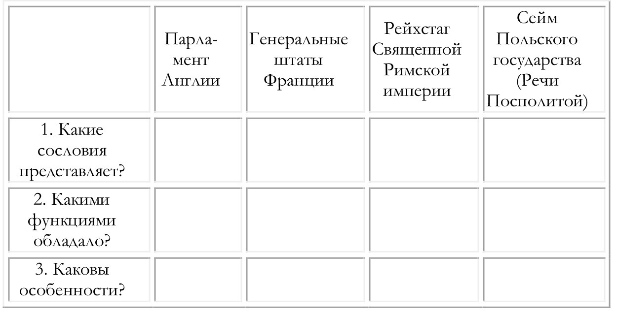 Ты составляешь таблицу и просто вписываешь информацию в колонки. К примеру Англия 1-феодалы всех рангов и верхушка горожан,2-совещательно-представительный орган,и так далее