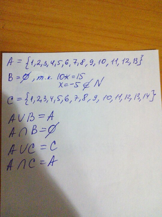B= { х I х ∈ N , 10-х = 15 } , C= { хIх N,∠ 15 } . 1) A ∪ B -? , 2) A ∩ B -?, 3) A ∪ C - ?, 4) A ∩ C - ? .