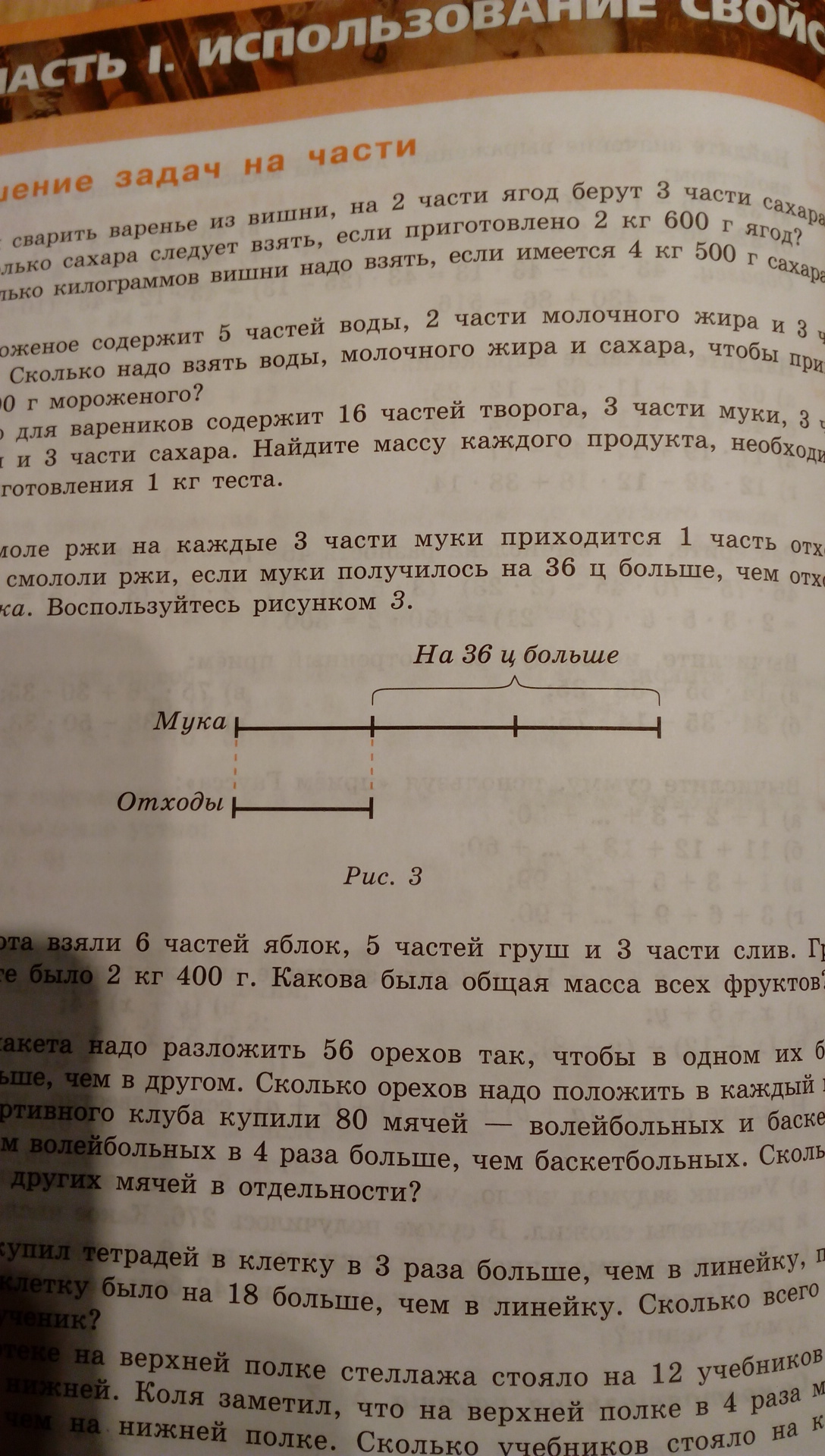 решите задачу на части! При помоле ржи на каждые 3 части муки приходится 1 часть отходов. Сколько смололи ржи, если муки получилось на 36ц. больше,чем отходов?