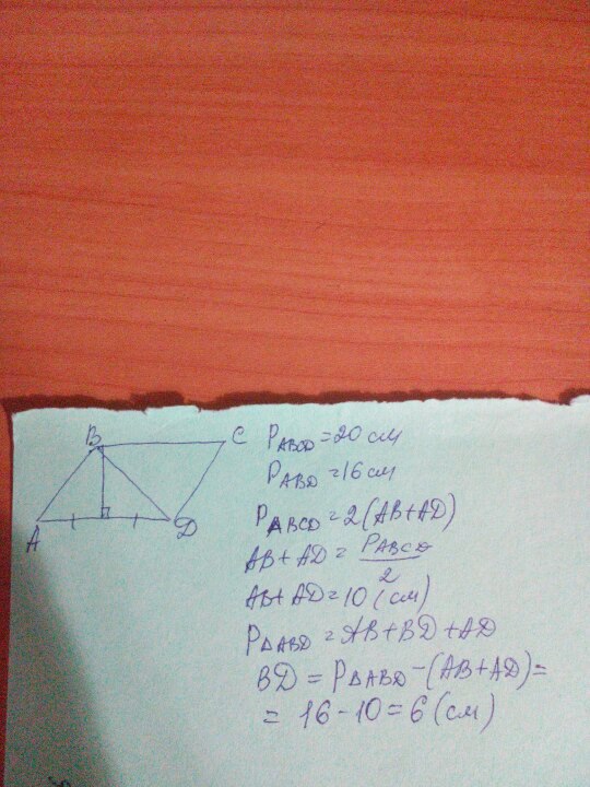 2BD=2P(ABD)-P(ABCD)=2*16-20=32-20=12см