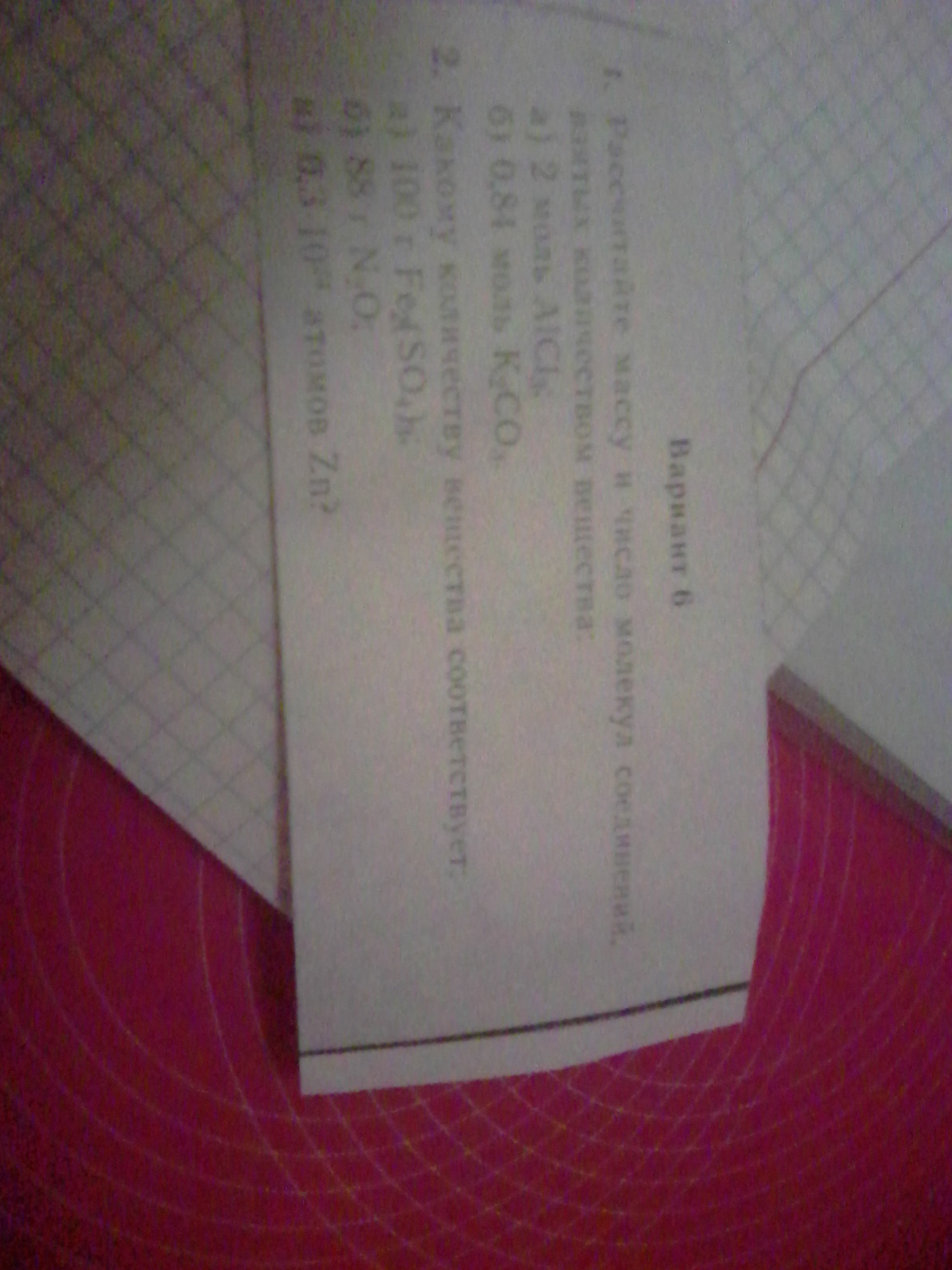 Помогите пожалуйсто :расчитайте массу и число молекул соеденений,взятых количеством вещества:a)2 моль AICL3;б)0,84 моль K2CO3