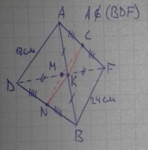 Точка А лежить поза площиною трикутника BDF. Точки N,M, C, K-середини вiдрiзкiв BN DF FA AB. Обчислiть периметр чотирикутника NMCK,якщо BF=24 AD=18