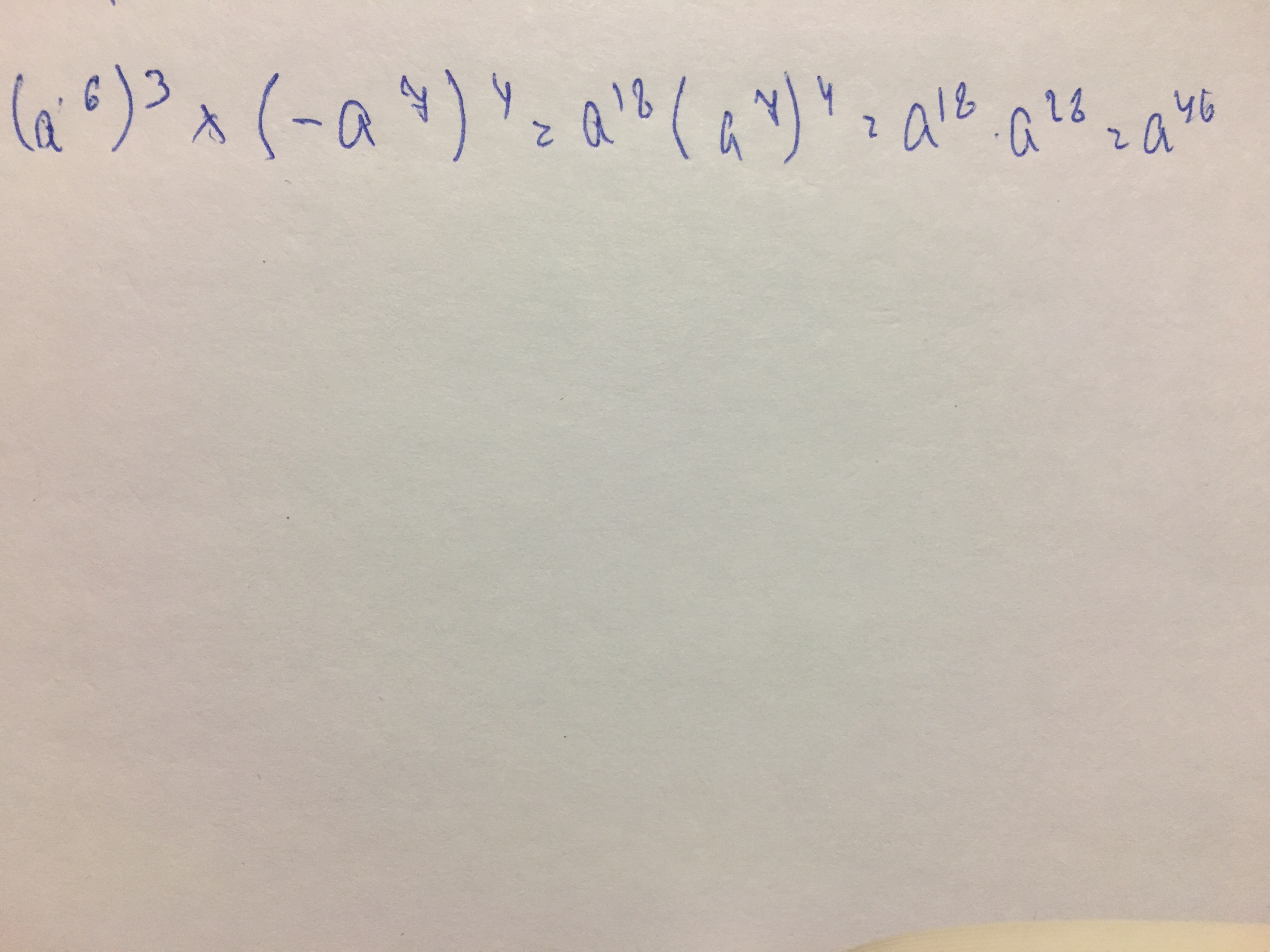 (-а⁶)³ * (-а⁷)⁴=-а¹⁸* -а²⁸=а¹⁸ * а²⁸=а¹⁸⁺²⁸=а⁴⁶