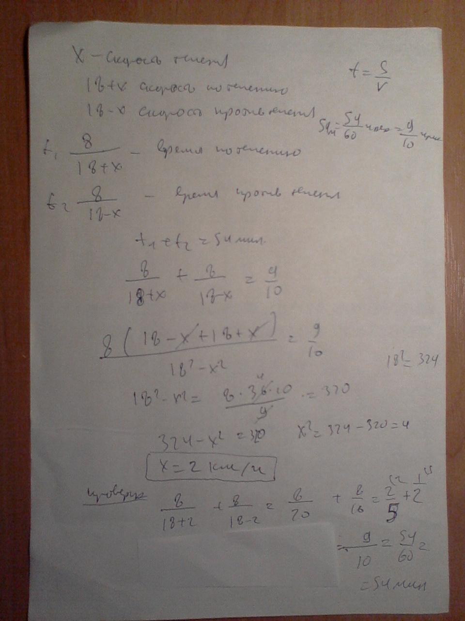 Моторная лодка проплыла 8 км по течению реки и вернулась обратно, потратив на весь путь 54 мин. Найдите скорость течения реки, если собственная скорость лодки равна 18 км/ч