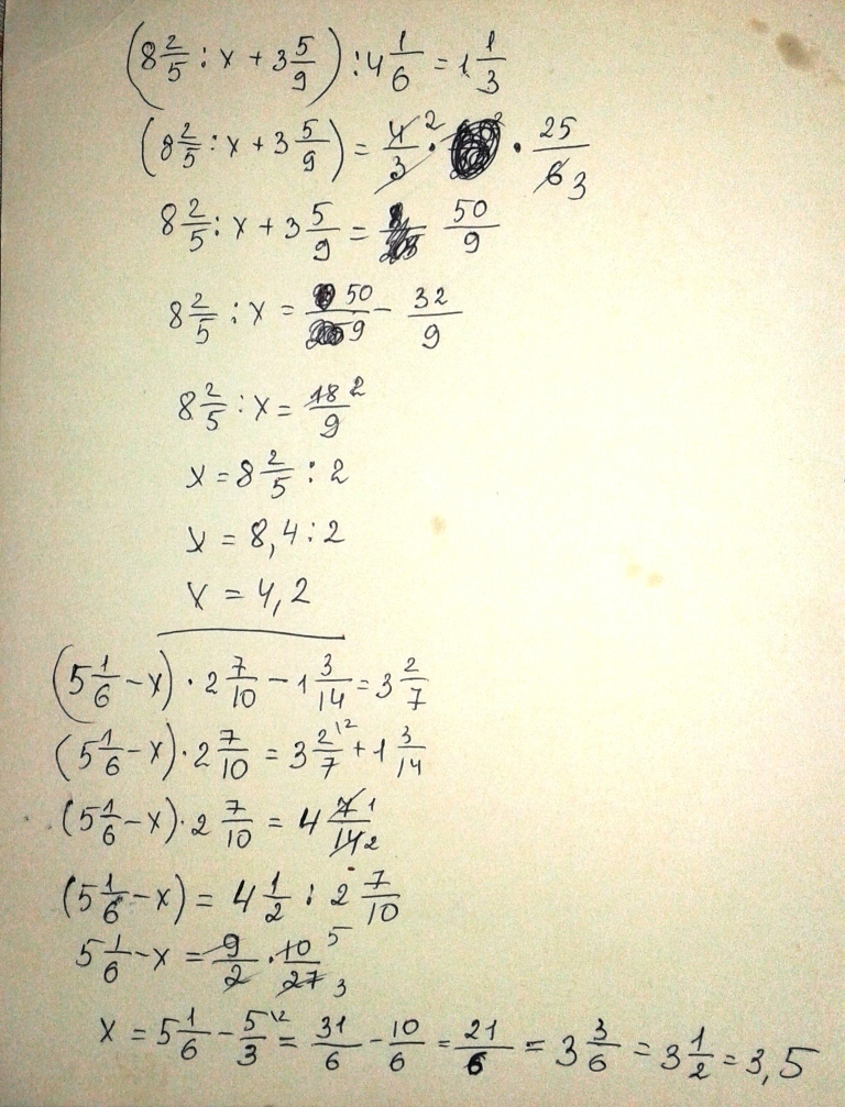 Решите уравнение (8 2/5:x+3 5/9):4 1/6=1 1/3